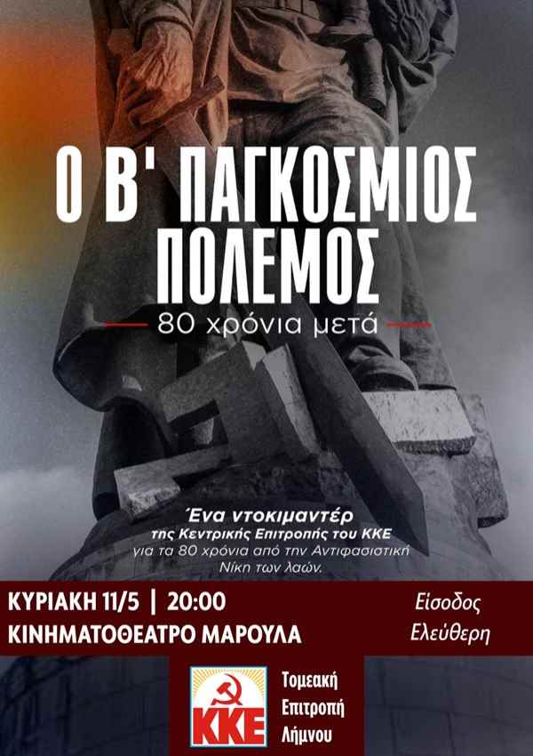 Με αφορμή την 80η επέτειο της 9ης του Μάη, Ημέρας της Αντιφασιστικής Νίκης των Λαών, η Τομεακη Επιτροπή του ΚΚΕ Λήμνου σας καλεί στην προβολή του ντοκιμαντέρ της Κεντρικής Επιτροπής του ΚΚΕ με τίτλο «Ο Β’ Παγκόσμιος Πόλεμος – 80 χρόνια μετά» την Κυριακή 11 Μαΐου στις 8 μ.μ. στο κινηματοθέατρο ΜΑΡΟΥΛΑ.
