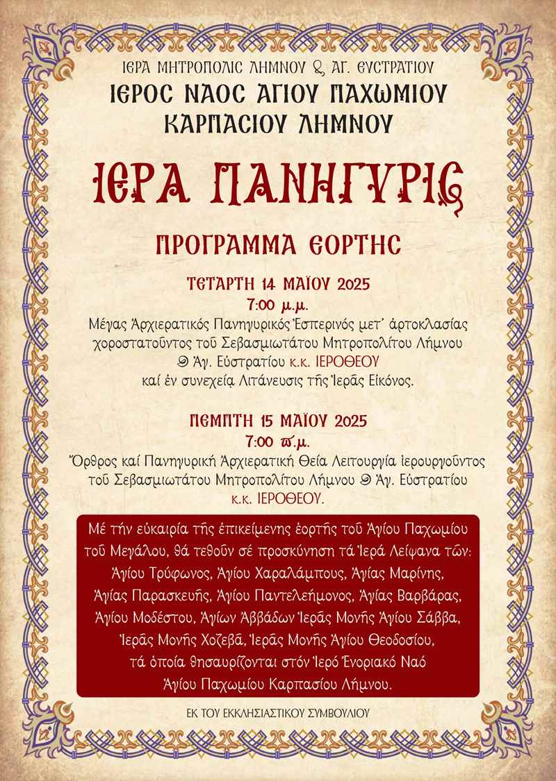 Με λαμπρότητα και κατάνυξη θα τιμηθεί και φέτος η μνήμη του Οσίου Παχωμίου του Μεγάλου στον Ιερό Ναό Αγίου Παχωμίου στο Καρπάσι Λήμνου, σύμφωνα με το επίσημο πρόγραμμα