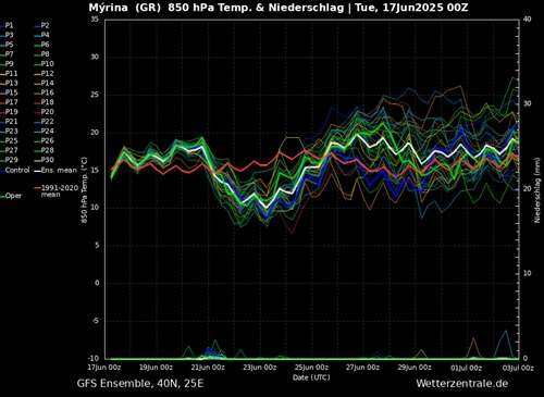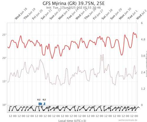 Από 25/6/25 έως 3/7/25 η τάση δείχνει έντονη ζέστη με μέγιστες τιμές 32-33 βαθμοί περίπου (2-3 βαθμούς πάνω από τον κλιματικό μέσο όρο περίπου)