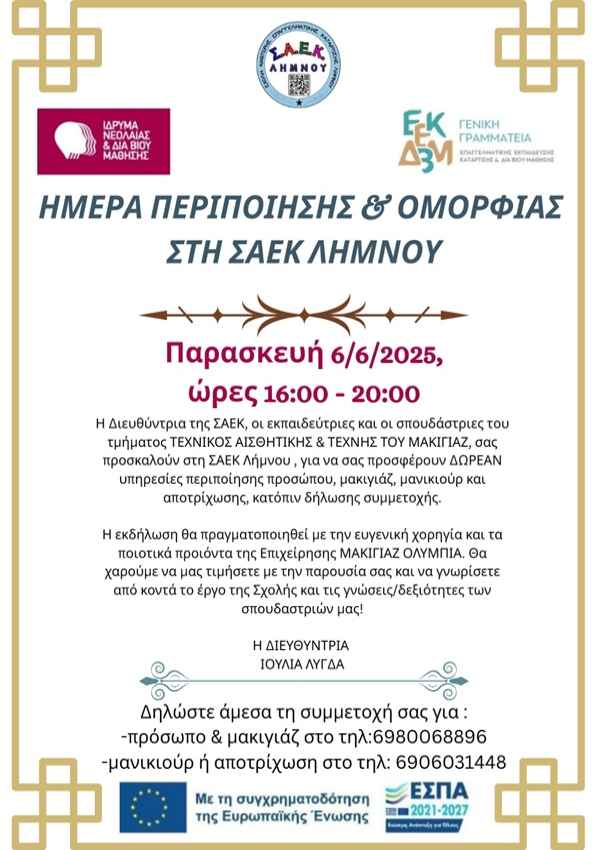 Μια ξεχωριστή εμπειρία ομορφιάς και φροντίδας περιμένει τις γυναίκες της Λήμνου την Παρασκευή 6 Ιουνίου 2025, από τις 16:00 έως τις 20:00, στον χώρο της ΣΑΕΚ Λήμνου.