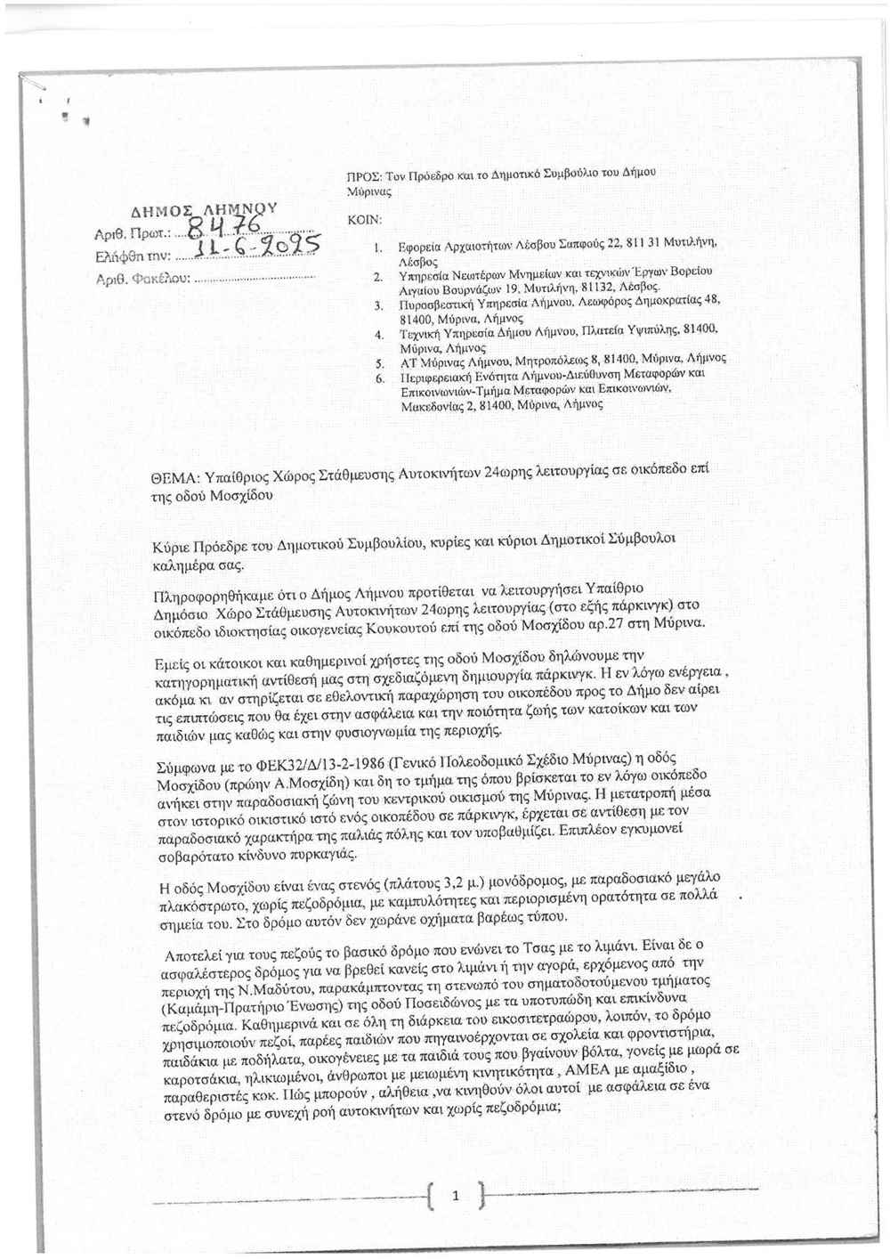 Σύμφωνα με το ΦΕΚ32/Δ/13-2-1986 (Γενικό Πολεοδομικό Σχέδιο Μύρινας) η οδός Μοσχίδου (πρώην Α. Μοσχίδη) και το τμήμα της όπου βρίσκεται το εν λόγω οικόπεδο ανήκει στον παραδοσιακό ιστό του κεντρικού οικισμού της Μύρινας. Η μετατροπή μέσου στον ιστορικό οικιστικό ιστό ενός οικοπέδου σε πάρκινγκ, έρχεται σε αντίθεση με τον παραδοσιακό χαρακτήρα της παλαιάς πόλης και τον υπαθρώο δημόσιο. Επιπλέον εγκυμονεί σοβαρότατο κίνδυνο πυρκαγιάς.