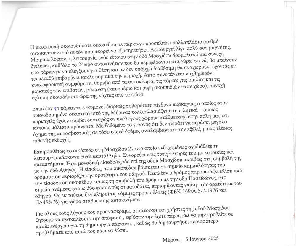 Για όλους τους λόγους που αναφέραμε, οι κάτοικοι και χρήστες της οδού Μοσχίδου ζητούμε να επανεξετάσετε και να ακυρώσετε τυχόν ενέργεια, εφόσον την έχετε πάρει, και να μην προβείτε σε καμία ενέργεια για τη δημιουργία πάρκινγκ, καθώς θα δημιουργήσει περισσότερα προβλήματα από αυτά που πάει να λύσει.