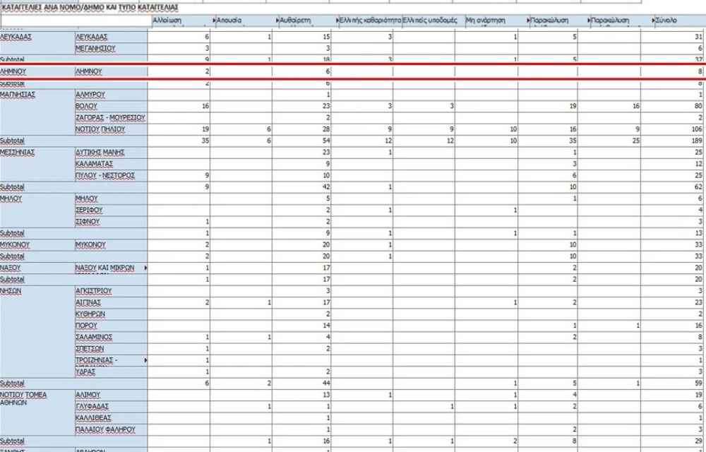 Στη Λήμνο για τον μήνα Ιούνιο υποβλήθηκαν 8 καταγγελίες