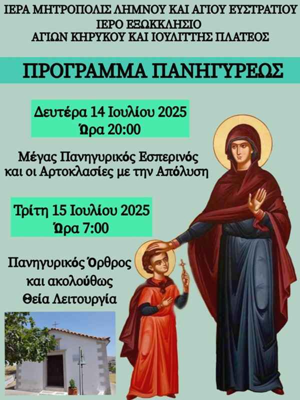 Η Εκκλησία μας τιμά τη μνήμη των Αγίων Μαρτύρων Κηρύκου και Ιουλίττης στο ομώνυμο εξωκκλησί που βρίσκεται στον Περιφερειακό Δρόμο Μύρινας Παραλίας Πλατέος