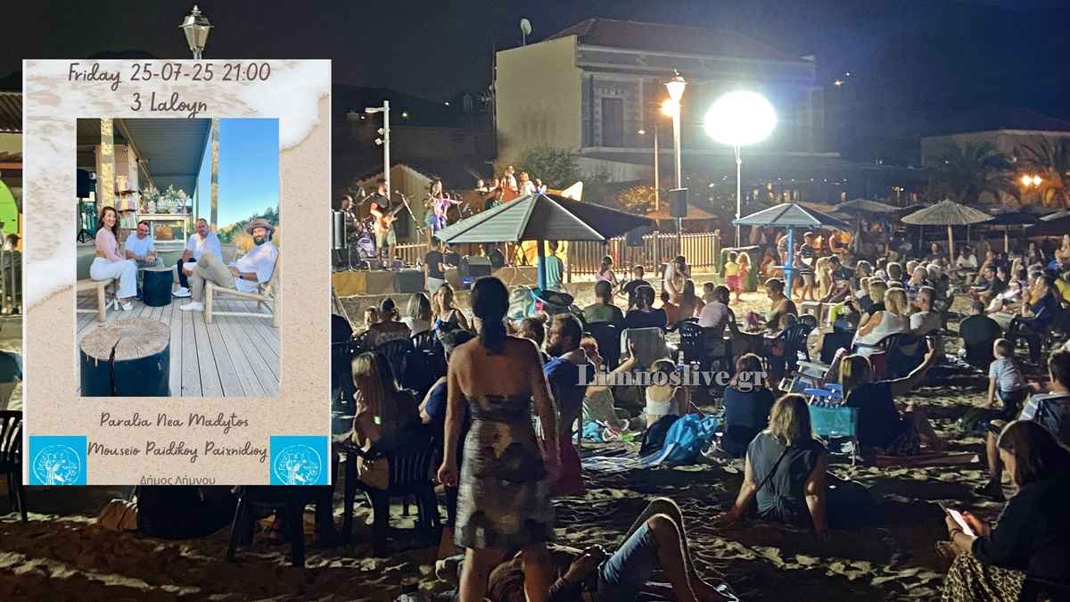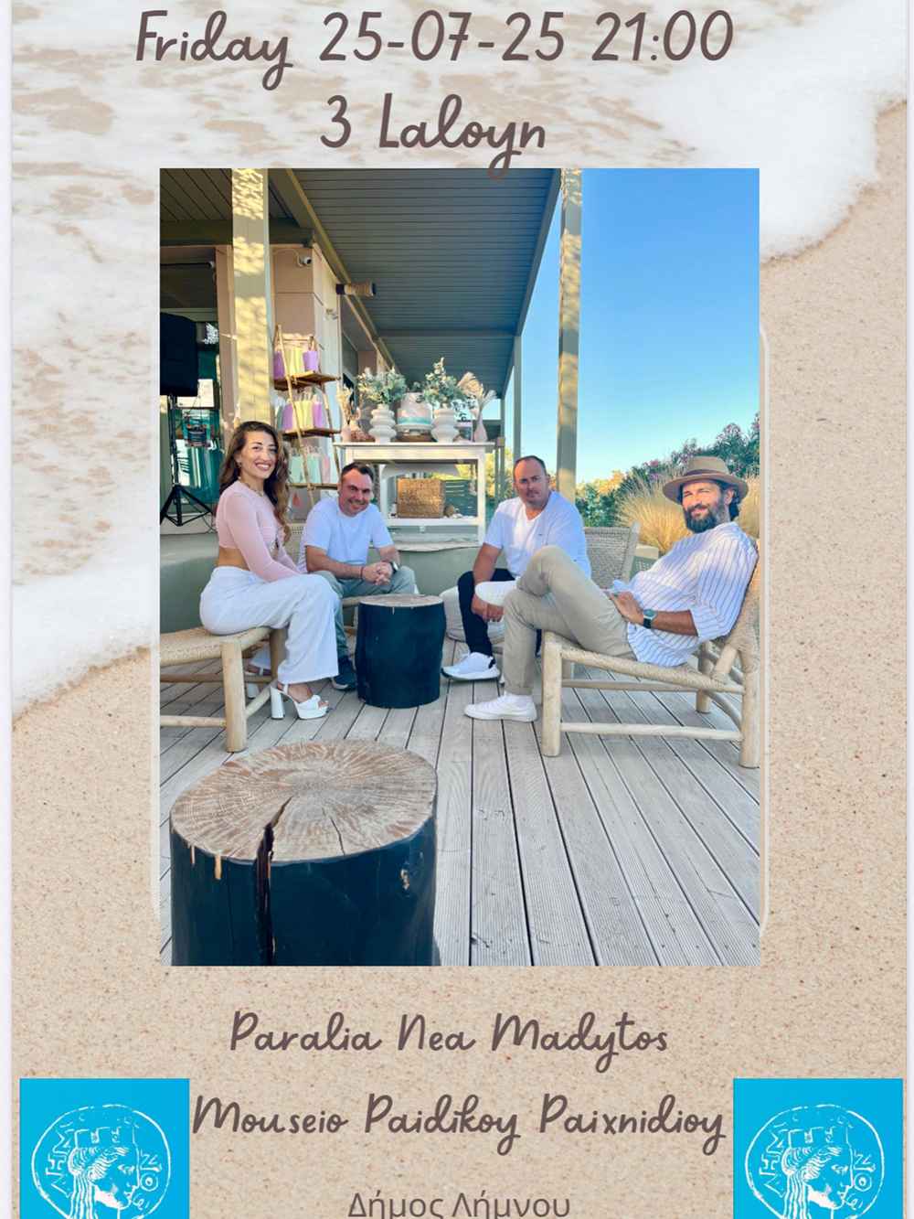 Η καλοκαιρινή νύχτα της Παρασκευής 25 Ιουλίου προβλέπεται… καυτή, και όχι μόνο λόγω θερμοκρασίας! Στις 21:00, η παραλία της Νέας Μαδύτου στη Μύρινα μετατρέπεται σε υπαίθρια μουσική σκηνή και υποδέχεται το αγαπημένο συγκρότημα 3 LALOUN BAND για μια μοναδική, ελεύθερη συναυλία κάτω από τα αστέρια!