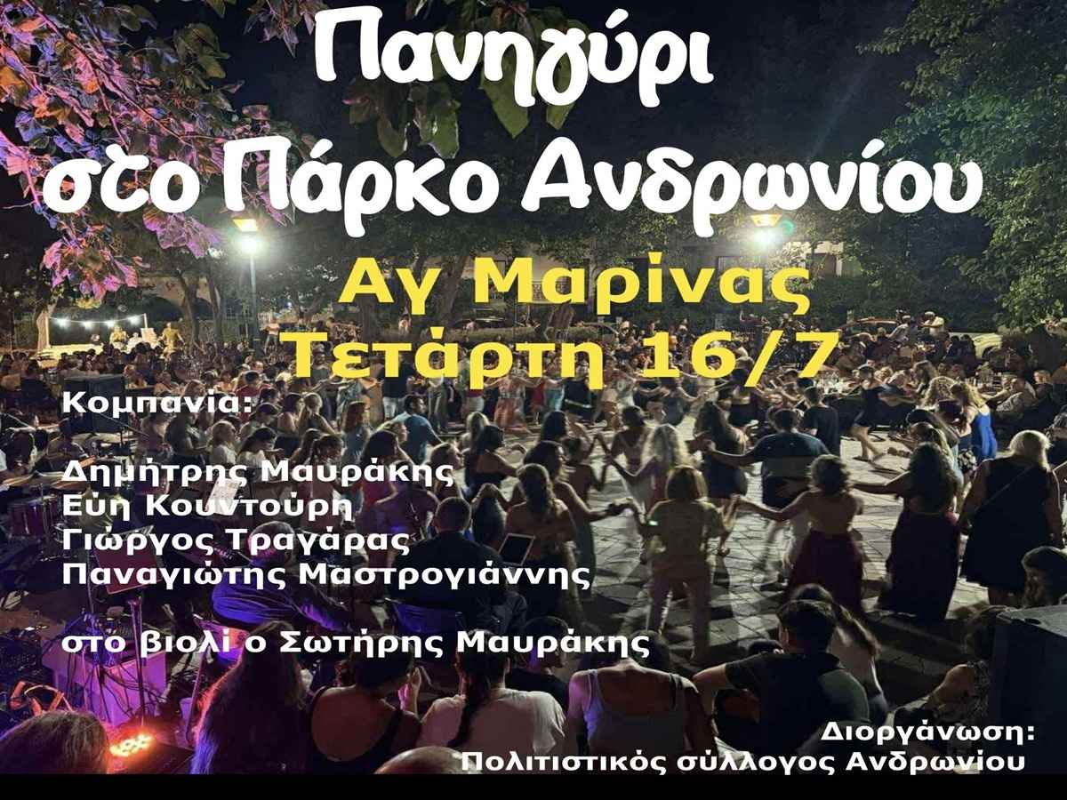 Το Πάρκο Ανδρωνίου ετοιμάζεται για μια βραδιά γεμάτη μουσική, χορό και αληθινό νησιώτικο ξεφάντωμα. Την Τετάρτη 16 Ιουλίου, ανήμερα της Αγίας Μαρίνας, ο Πολιτιστικός Σύλλογος Ανδρωνίου διοργανώνει για πρώτη φορά ένα δεύτερο πανηγύρι στον αγαπημένο αυτό χώρο του χωριού, δίνοντας την ευκαιρία για ακόμα μία μεγάλη γιορτή μέσα στο καλοκαίρι.