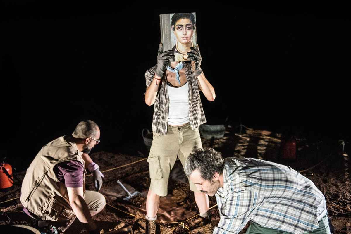Στη σκηνή δεν πρωταγωνιστούν μόνο οι λέξεις, αλλά και η ίδια η διαδικασία της ανακάλυψής τους: πέντε ερμηνευτές/αρχαιολόγοι «σκάβουν» θεατρικά κάτω από τον ήλιο, εξοπλισμένοι με εργαλεία ανασκαφής, προσπαθώντας να συνθέσουν έναν κόσμο που χάθηκε φωνές, λέξεις και στιγμές από παραστάσεις χιλιάδες χρόνια πριν. Η σκηνική δράση εξελίσσεται με φυσικό φως και ακολουθεί τη ροή μιας αρχαιολογικής ημέρας.