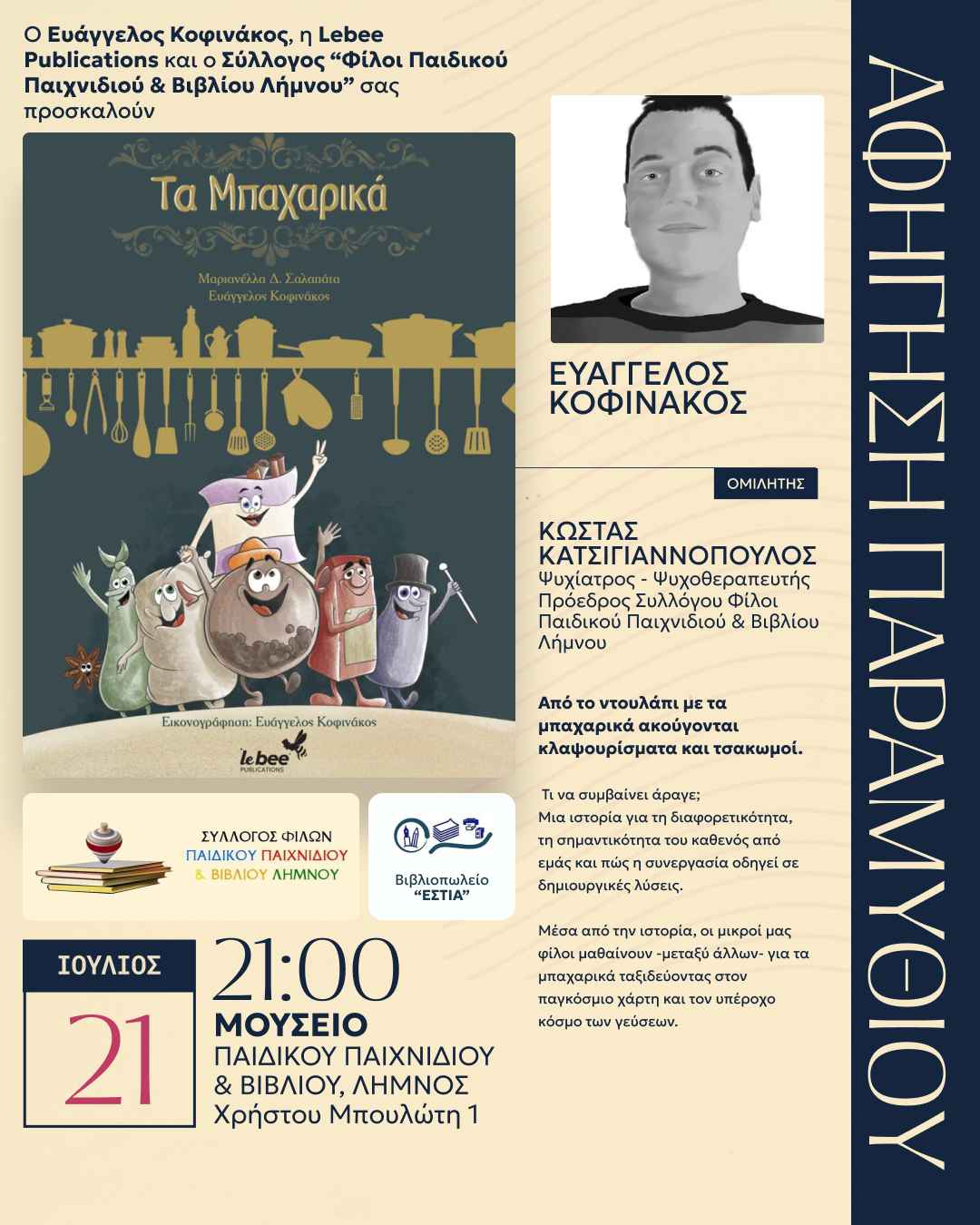 Ο Ευάγγελος Κοφινάκος, οι εκδόσεις Lebee Publications και ο Σύλλογος “Φίλοι Παιδικού Παιχνιδιού & Βιβλίου Λήμνου” σας προσκαλούν σε μία μοναδική αφήγηση παιδικού παραμυθιού που υπόσχεται να ταξιδέψει μικρούς και μεγάλους στον γευστικό κόσμο των… μπαχαρικών!