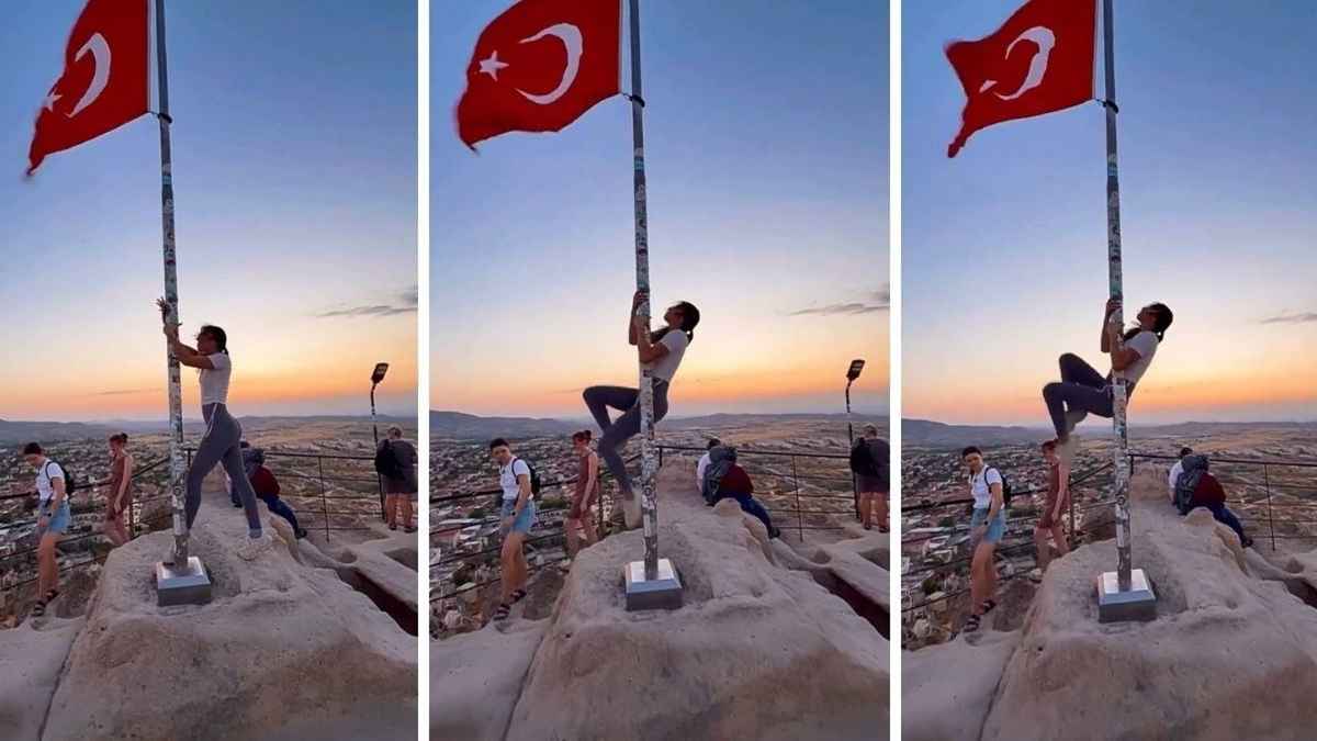 🔴 Türkiye’nin önemli turizm merkezlerinden Kapadokya’nın Uçhisar beldesindeki tarihi kaledeki Türk bayrağı direğinde dans gösterisi yapan yabancı uyruklu kadın turist hakkında soruşturma başlatıldı. pic.twitter.com/s14fmbCP5S