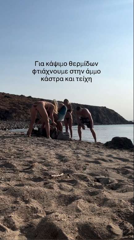 Η παρουσιάστρια φαίνεται να απολαμβάνει κάθε στιγμή, από το να φτιάχνει κάστρα στην άμμο «σαν μικρό παιδί» μέχρι να γεύεται τα τοπικά εδέσματα και να συμμετέχει στη γιορτινή ατμόσφαιρα των πανηγυριών.