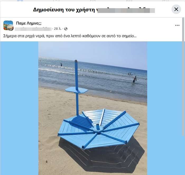 Σήμερα, στα ρηχά νερά στη Μυρομα, ένας λουόμενος γλίτωσε στο παρά πέντε από πιθανό τραυματισμό, όταν η ξύλινη παραλιακή ομπρέλα έσπασε από τους δυνατούς ανέμους. Όπως ανέφερε ο ίδιος σε ανάρτησή του στην ομάδα «Πάμε Λήμνο»: «Σήμερα στα ρηχά νερά, πριν από ένα λεπτό καθόμουν σε αυτό το σημείο…».
