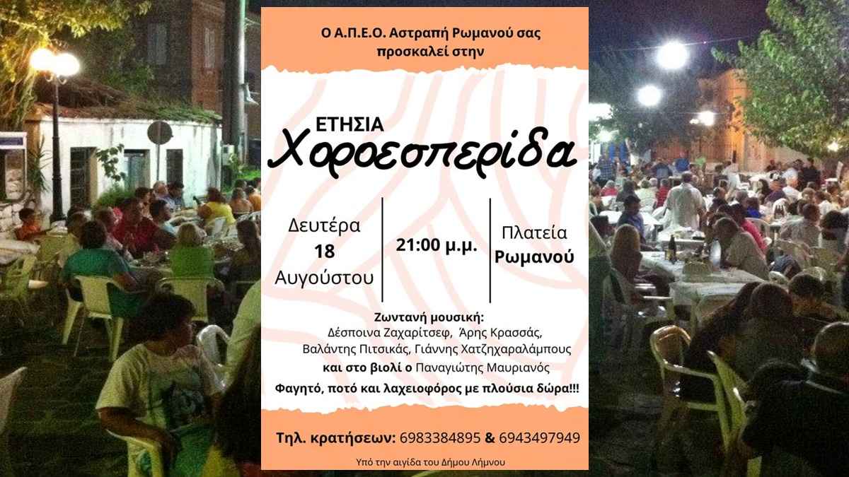 Ο Α.Π.Ε.Ο. Αστραπή Ρωμανoύ προσκαλεί όλο τον κόσμο απόψε, Δευτέρα 18 Αυγούστου, στην ετήσια χοροεσπερίδα του, που θα πραγματοποιηθεί στην Πλατεία Ρωμανoύ στις 21:00.