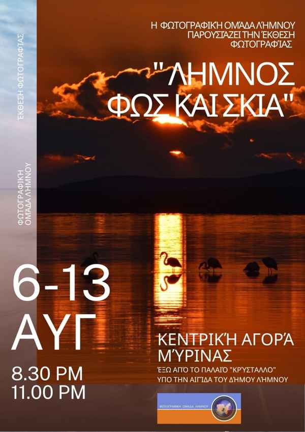 Η Φωτογραφική Ομάδα Λήμνου, μια ομάδα από ερασιτέχνες και επαγγελματίες φωτογράφους της Λήμνου και κυρίως λάτρεις της φωτογραφίας, καλεί όλους τους επισκέπτες και κατοίκους του νησιού στην ομαδική έκθεση φωτογραφίας που διοργανώνεται στον χώρο έξω από το παλαιό Κρύσταλλο στην αγορά Μύρινας από 6 έως 13 Αυγούστου με θέμα ” Λήμνος: Φως και Σκιά”.