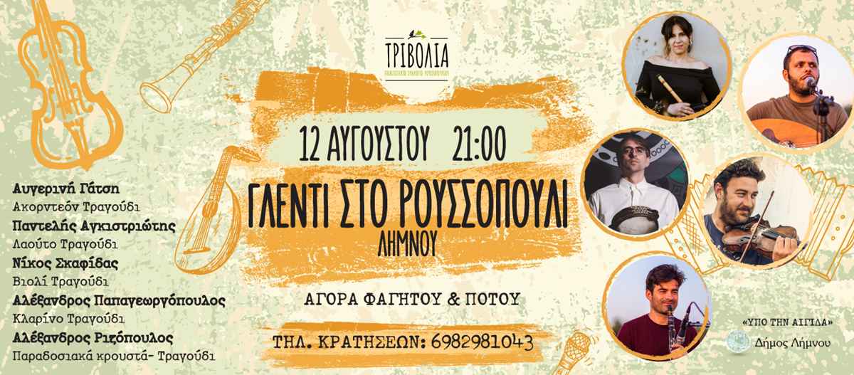 Με σκοπό να καθιερώσει την 12η Αυγούστου ως μέρα συνάντησης στο Ρουσσοπούλι, τα Τριβόλια, σας περιμένουν και φέτος στον υπέροχο χώρο του πρώην Δημοτικού Σχολείου, με ρυθμούς από στεριά και θάλασσα, από την Κρήτη μέχρι τον Έβρο, την Μακεδονία και την Ηπειρο! Και φυσικά στο επίκεντρο η μοναδική μουσική παράδοση της Λήμνου με τους ντόπιους χορούς.