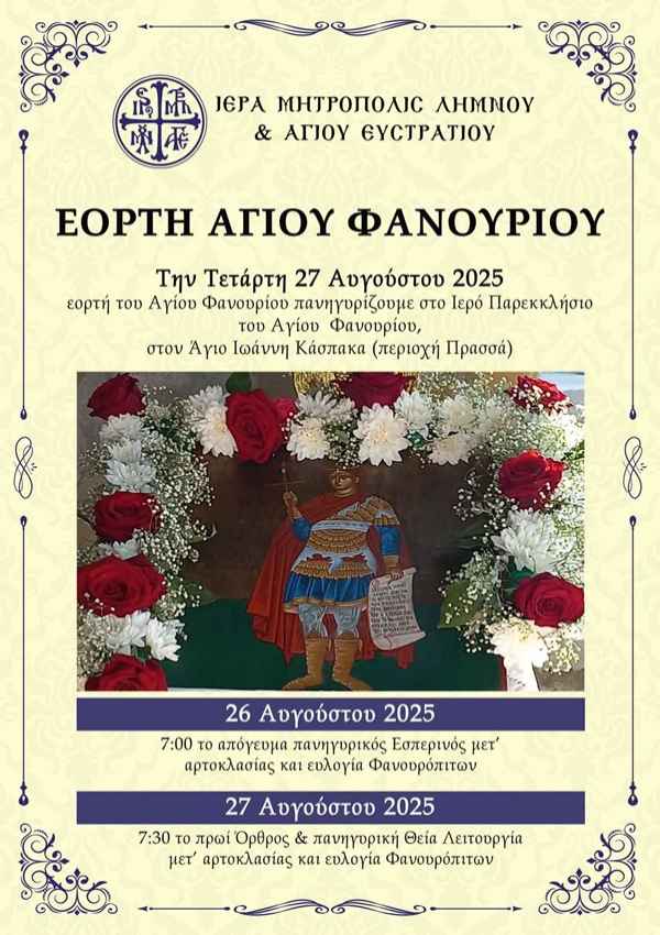 Κάθε χρόνο στα τέλη Αυγούστου, η Λήμνος τιμά με λαμπρότητα τον Άγιο Μάρτυρα Φανούριο τον νεοφανή και θαυματουργό, έναν από τους πιο αγαπητούς Αγίους της Ορθοδοξίας. Η μνήμη του συνδέεται με έθιμα που διατηρούνται ζωντανά μέχρι σήμερα, με πιο χαρακτηριστικό την παρασκευή και ευλογία των γνωστών φανουρόπιτων.