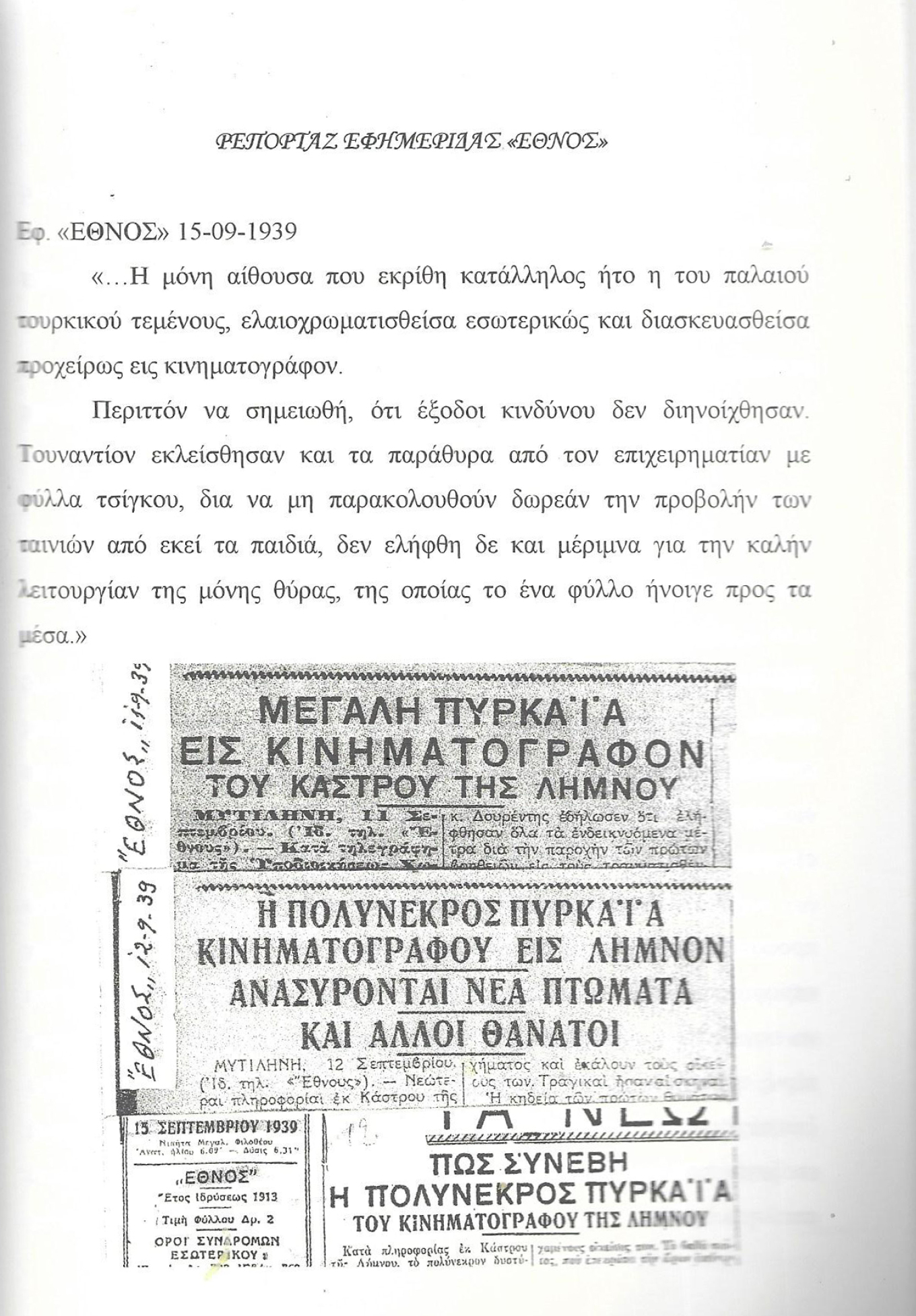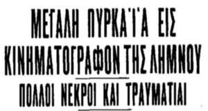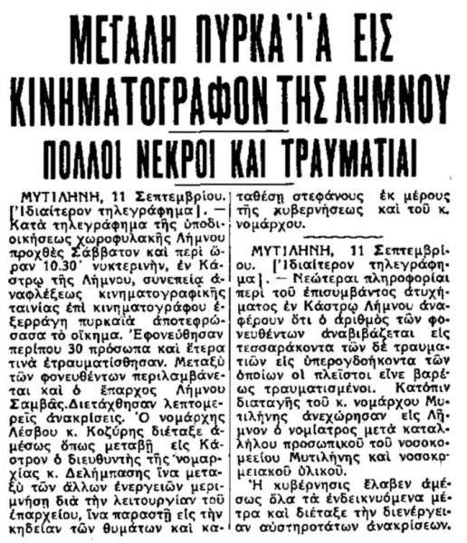 «Περιοδεύων κινηματογραφικός μικροεπιχειρηματίας τη μεσολαβήσει τριών κυριών της εκλεκτής κοινωνίας της πρωτευούσης, λαβών άδειαν προβολής, ην επί δεκαημέρου η αστυνομία ηρνείτο να χορηγήσει, επρόβαλεν εν κλειστώ χώρω». Αλλά και ο δεκάχρονος τότε Δ. Ντόντος, που ήταν ανάμεσα στους θεατές της ταινίας και κατάφερε να σωθεί, γράφει στην εφημερίδα «Λήμνος» στις 27 / 01 / 2005: