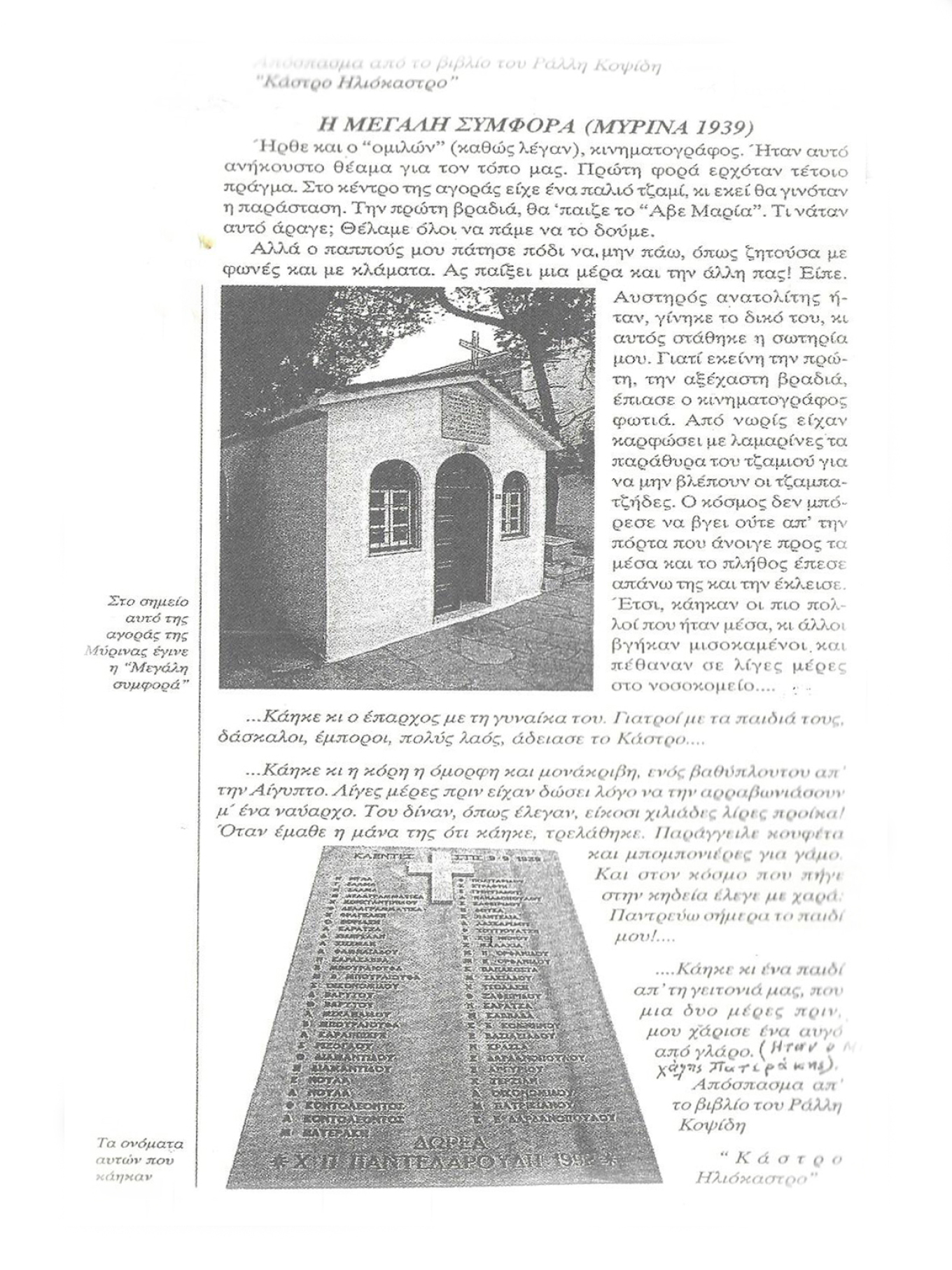 Πριν από 85 χρόνια, στις 9 Σεπτεμβρίου 1939, η Λήμνος, αλλά και ολόκληρη η Ελλάδα θρήνησαν σχεδόν 60 νεκρούς, από πυρκαγιά που ξέσπασε στον κινηματογράφο, παλιό οθωμανικό τζαμί, στη Μύρινα, την πρωτεύουσα του πανέμορφου αιγαιοπελαγίτικου νησιού μας. Στο τραγικό και μάλλον άγνωστο αυτό γεγονός, έχει αναφερθεί εκτενώς ο Λημνιός οδοντίατρος και μελετητής της ιστορίας του νησιού Αριστείδης Τσοτρούδης, στο βιβλίο του «Η ΜΕΓΑΛΗ ΣΥΜΦΟΡΑ ΤΗΣ ΛΗΜΝΟΥ, 9/9/1939 ΩΡΑ Μ.Μ.», ΛΗΜΝΟΣ 2008. Το βιβλίο αυτό περιέχει πολύτιμες και μοναδικές πληροφορίες για το τραγικό συμβάν, ακόμα και μαρτυρίες κάποιων που επέζησαν από την τραγωδία