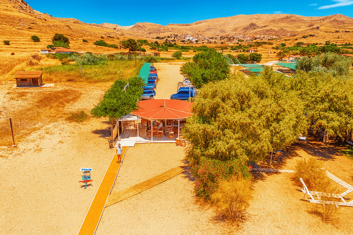 Η πρόσβαση είναι πανεύκολη, με άνετο πάρκινγκ και λίγα μόλις λεπτά από τη Μύρινα.