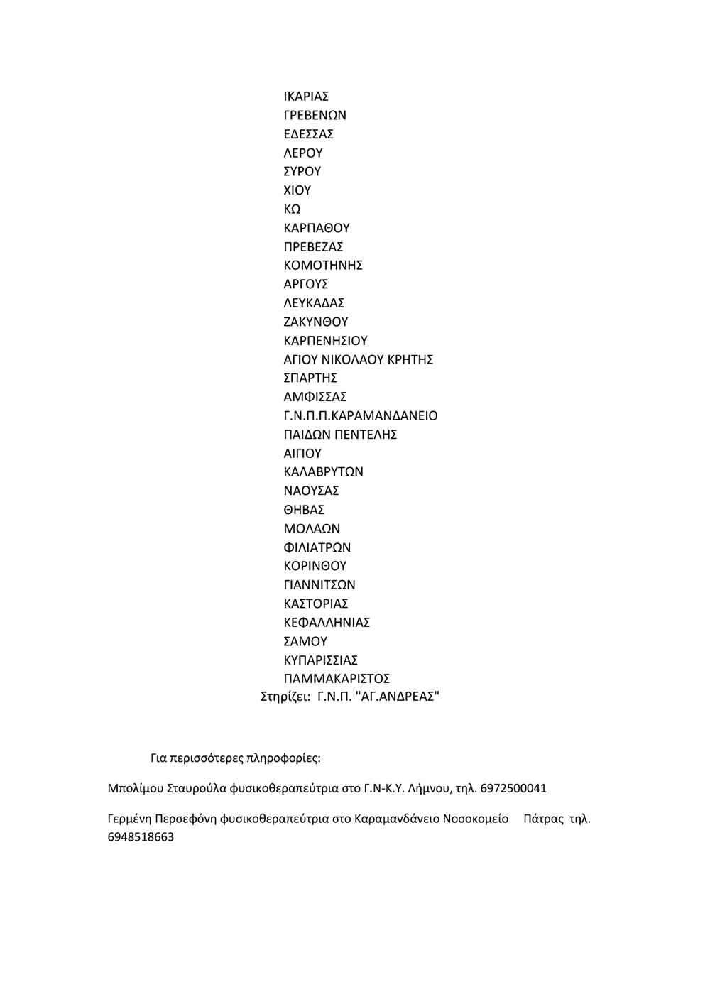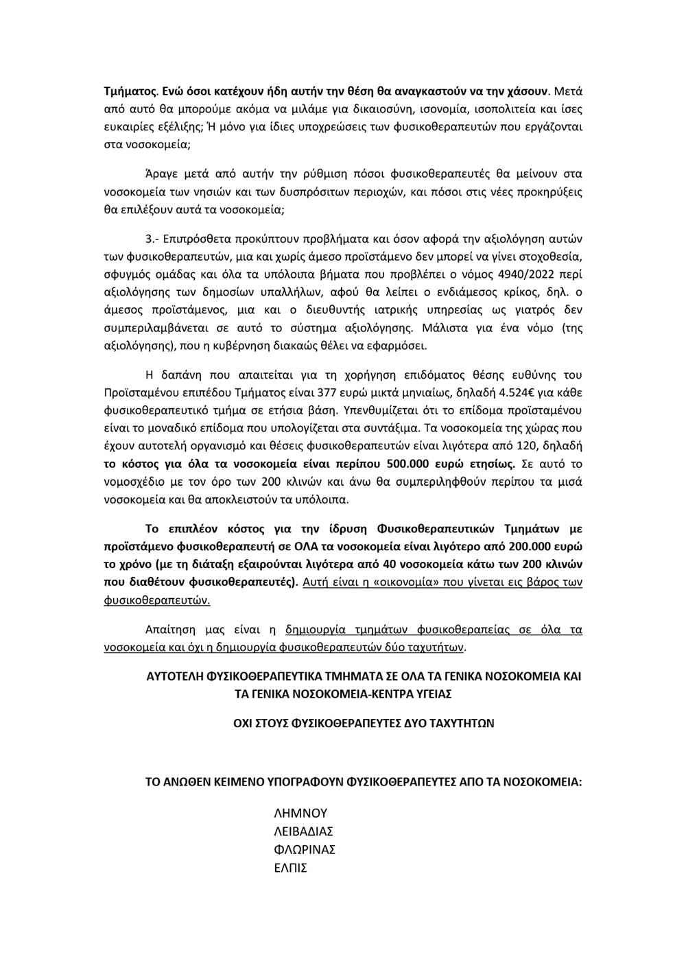 Το κείμενο διαμαρτυρίας υπογράφεται από φυσικοθεραπευτές νοσοκομείων σε όλη την Ελλάδα, μεταξύ των οποίων και οι φυσικοθεραπευτές του Νοσοκομείου Λήμνου, εκφράζοντας κοινό μέτωπο αντίδρασης απέναντι στις προωθούμενες ρυθμίσεις.