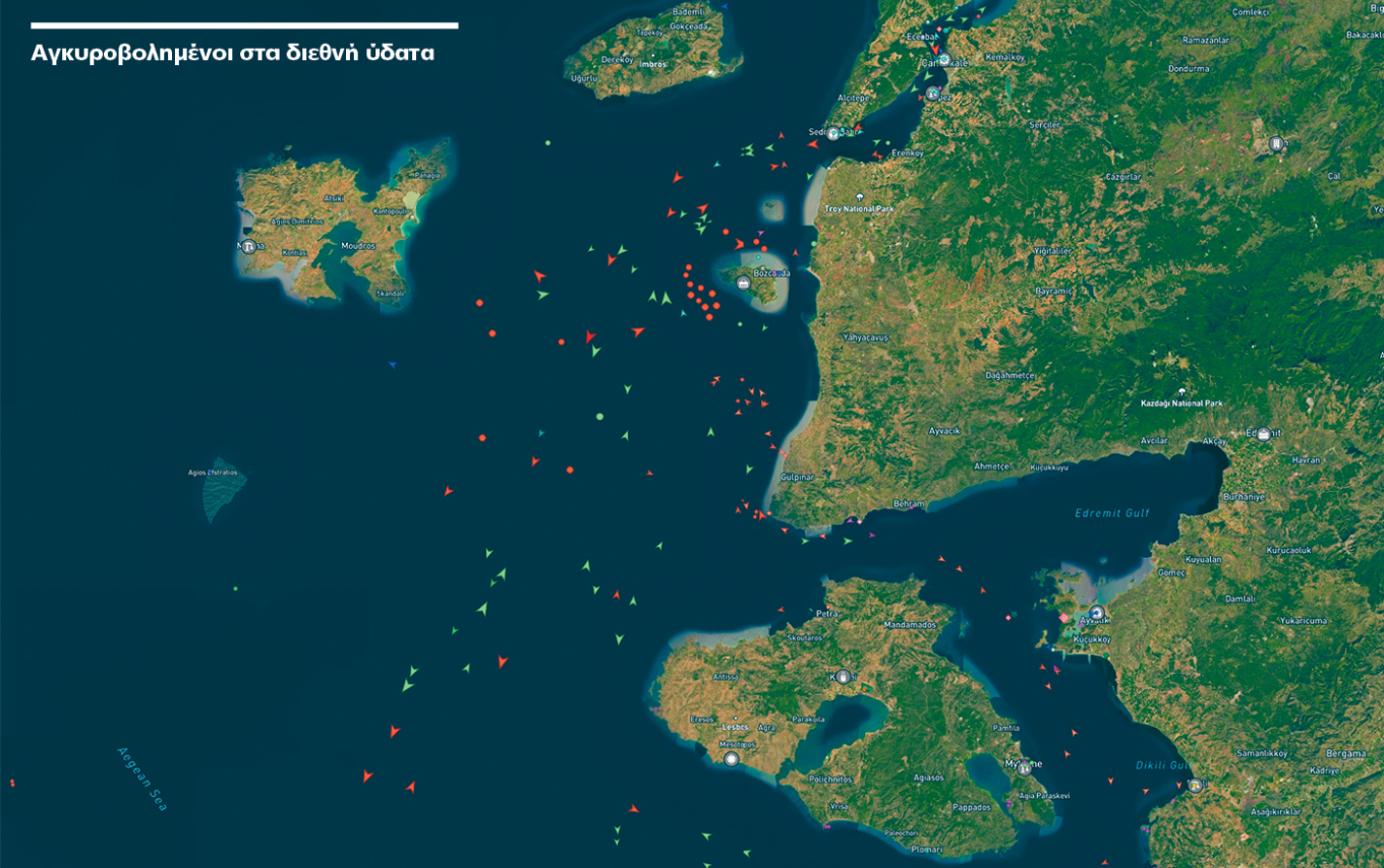 Η φωτογραφία από το Marine Traffic, τραβηγμένη τη νύχτα της Παρασκευής, δείχνει αρκετά πλοία -τάνκερ τα περισσότερα- αγκυροβολημένα (απεικονίζονται με έναν κόκκινο κύκλο) στα διεθνή ύδατα, στο Βόρειο Αιγαίο. Σημειώνεται ότι σε πάρα πολλές περιπτώσεις μεταφόρτωσης πετρελαίου STS (από πλοίο σε πλοίο), τα εμπλεκόμενα σκάφη κλείνουν τα μηχανήματα εντοπισμού