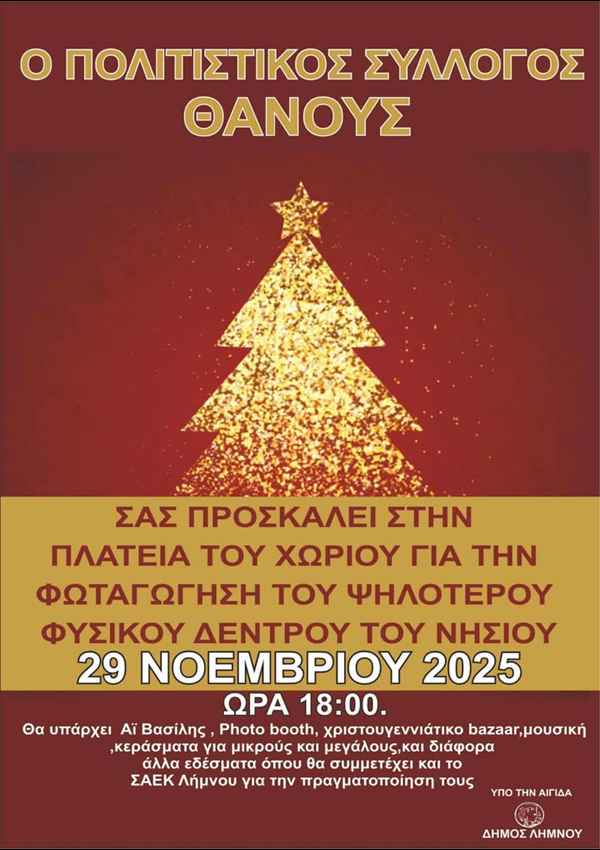 Η μαγεία των Χριστουγέννων πλημμυρίζει για ακόμη μία χρονιά την πλατεία του Θάνους, με τον Πολιτιστικό Σύλλογο του χωριού να δίνει το σύνθημα για την έναρξη της εορταστικής περιόδου. Το Σάββατο 29 Νοεμβρίου 2025 στις 18:00, κάτοικοι και επισκέπτες καλούνται να ζήσουν μια μοναδική εμπειρία, καθώς θα πραγματοποιηθεί η φωταγώγηση του ψηλότερου φυσικού χριστουγεννιάτικου δέντρου της Λήμνου.