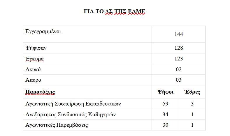 Με βάση το καταστατικό της ΕΛΜΕ οι έδρες στο νέο Διοικητικό Συμβούλιο κατανέμονται ως εξής: Αγωνιστική Συσπείρωση Εκπαιδευτικών 3 έδρες, Ανεξάρτητος Συνδυασμός Καθηγητών 1 έδρα και Αγωνιστικές Παρεμβάσεις 1 έδρα.