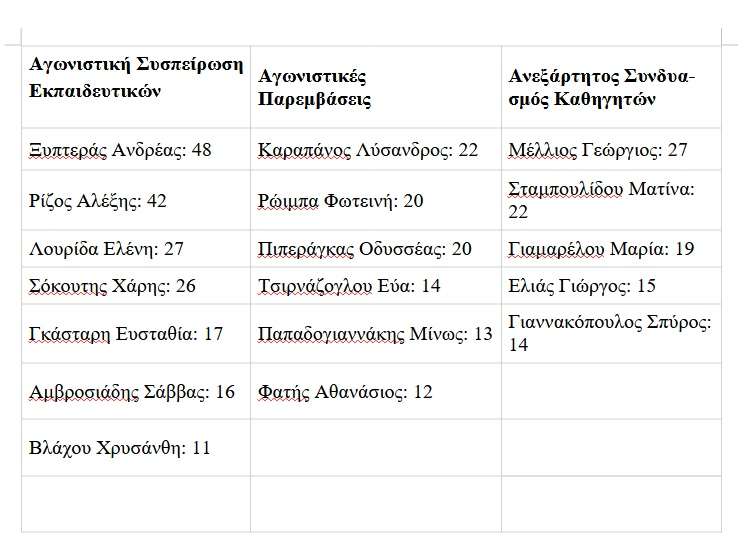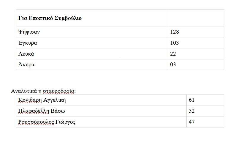 Ευχαριστούμε θερμά τα μέλη της εφορευτικής επιτροπής: Βρύζα Κωνσταντίνο, Κωστακιώτη Ανδρέα, Σαλαγκούδη Μαρία, Πάλλα Δόμνα και Αλαμάνου Μαρία για την ανεκτίμητη βοήθεια και τη μεγάλη υπομονή τους. Αναλυτικά τα αποτελέσματα έχουν ως εξής: