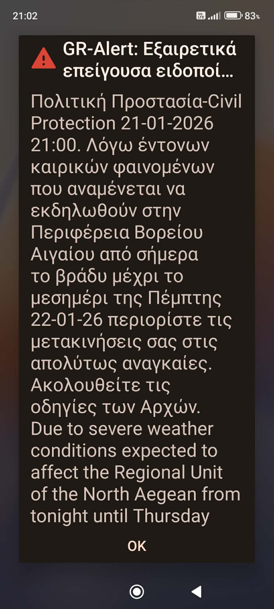 Πολιτική Προστασία-Civil Protection 21-01-2026 21:00. Λόγω έντονων καιρικών φαινομένων που αναμένεται να εκδηλωθούν στην Περιφέρεια Βορείου Αιγαίου από σήμερα το βράδυ μέχρι το μεσημέρι της Πέμπτης 22-01-26 περιορίστε τις μετακινήσεις σας στις απολύτως αναγκαίες. Ακολουθείτε τις οδηγίες των Αρχών.