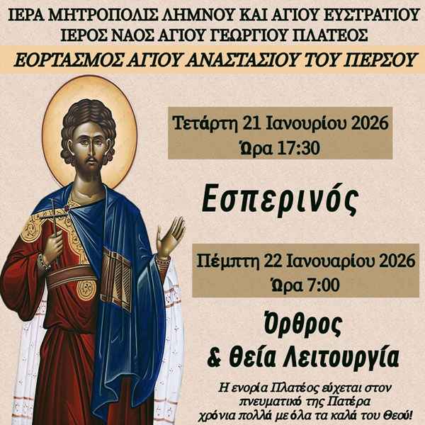 Λήμνος: Ενορία Πλατέος, Τιμά τον Άγιο Αναστάσιο τον Πέρση και τον εφημέριο της!