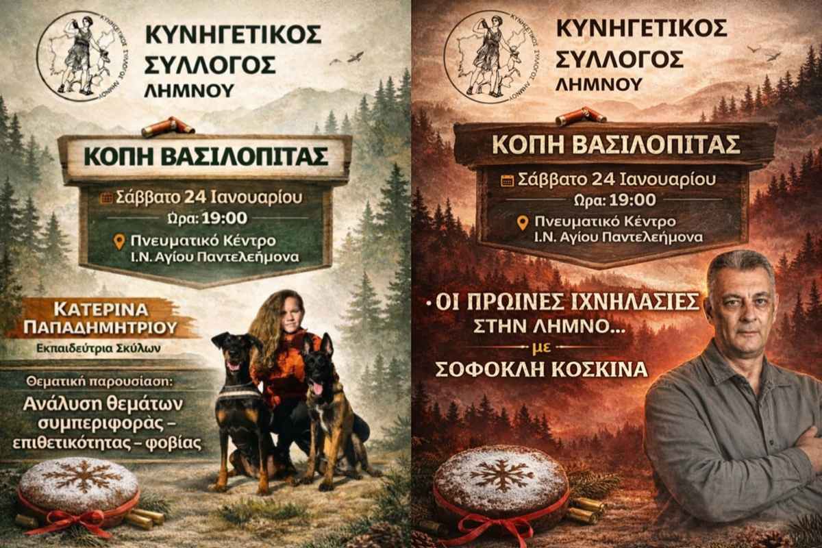 Την καθιερωμένη του κοπή Βασιλόπιτας πραγματοποιεί ο Κυνηγετικός Σύλλογος Λήμνου, το Σάββατο 24 Ιανουαρίου, στις 19:00, στο Πνευματικό Κέντρο του Ι.Ν. Αγίου Παντελεήμονα.