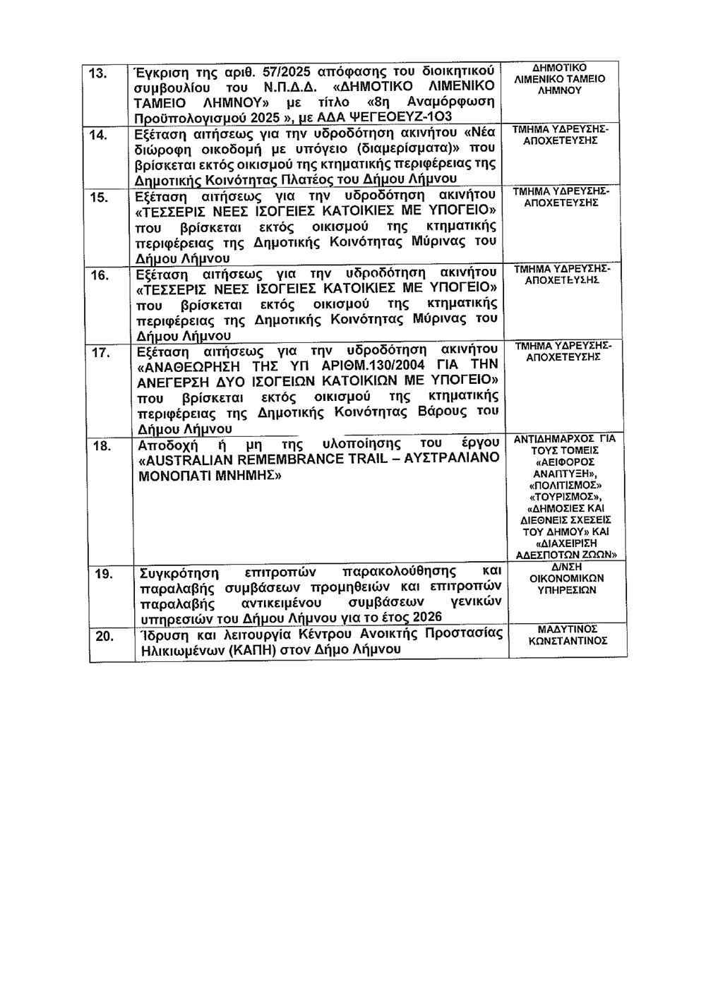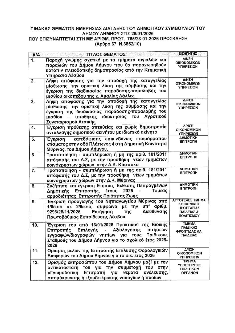 Στις 28 Ιανουαρίου 2026 ημέρα Τετάρτη και ώρα 17.00 στην αίθουσα συνεδριάσεων του Δημοτικού Συμβουλίου Λήμνου, θα γίνει η 1η Ειδική συνεδρίαση λογοδοσίας της δημοτικής αρχής για το δίμηνο Νοεμβρίου-Δεκεμβρίου 2025 και αμέσως μετά στις 17:30 θα ξεκινήσει το Δημοτικό Συμβούλιο που τα θέματα του είναι τα παρακάτω: