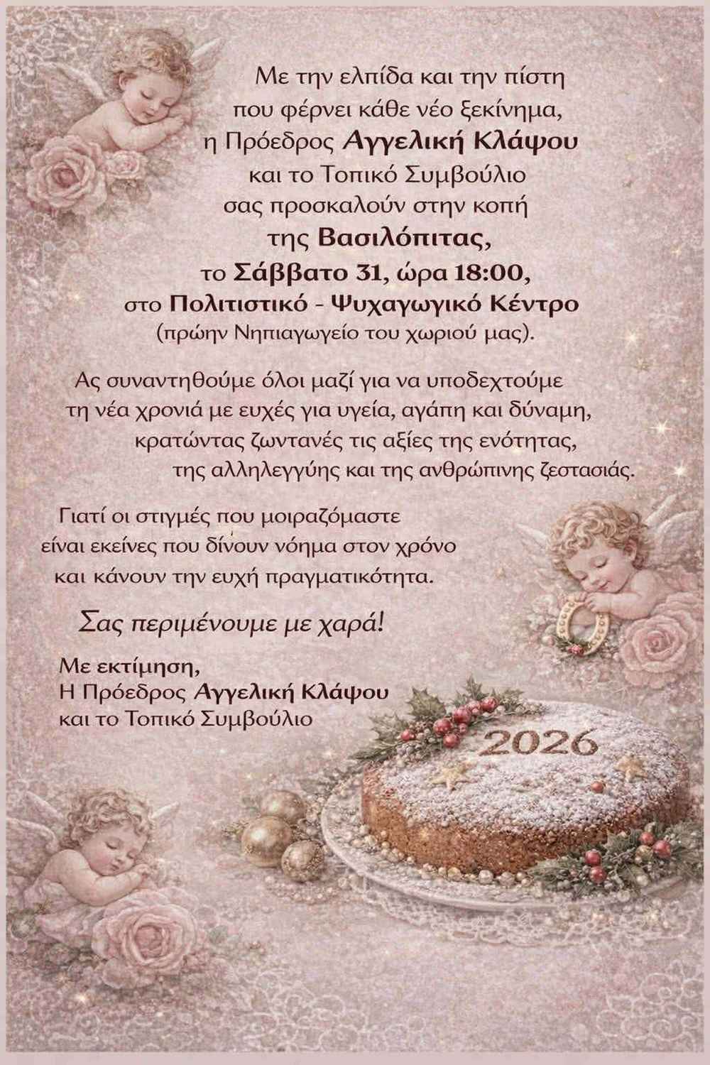 Το Σάββατο 31 Ιανουαρίου, στις 18.00, στο Πολιτιστικό και Ψυχαγωγικό Κέντρο, πρώην νηπιαγωγείο, η Πρόεδρος Αγγελική Κλάψου και το Τοπικό Συμβούλιο ανοίγουν τη χρονιά με ευχές, χαμόγελα
