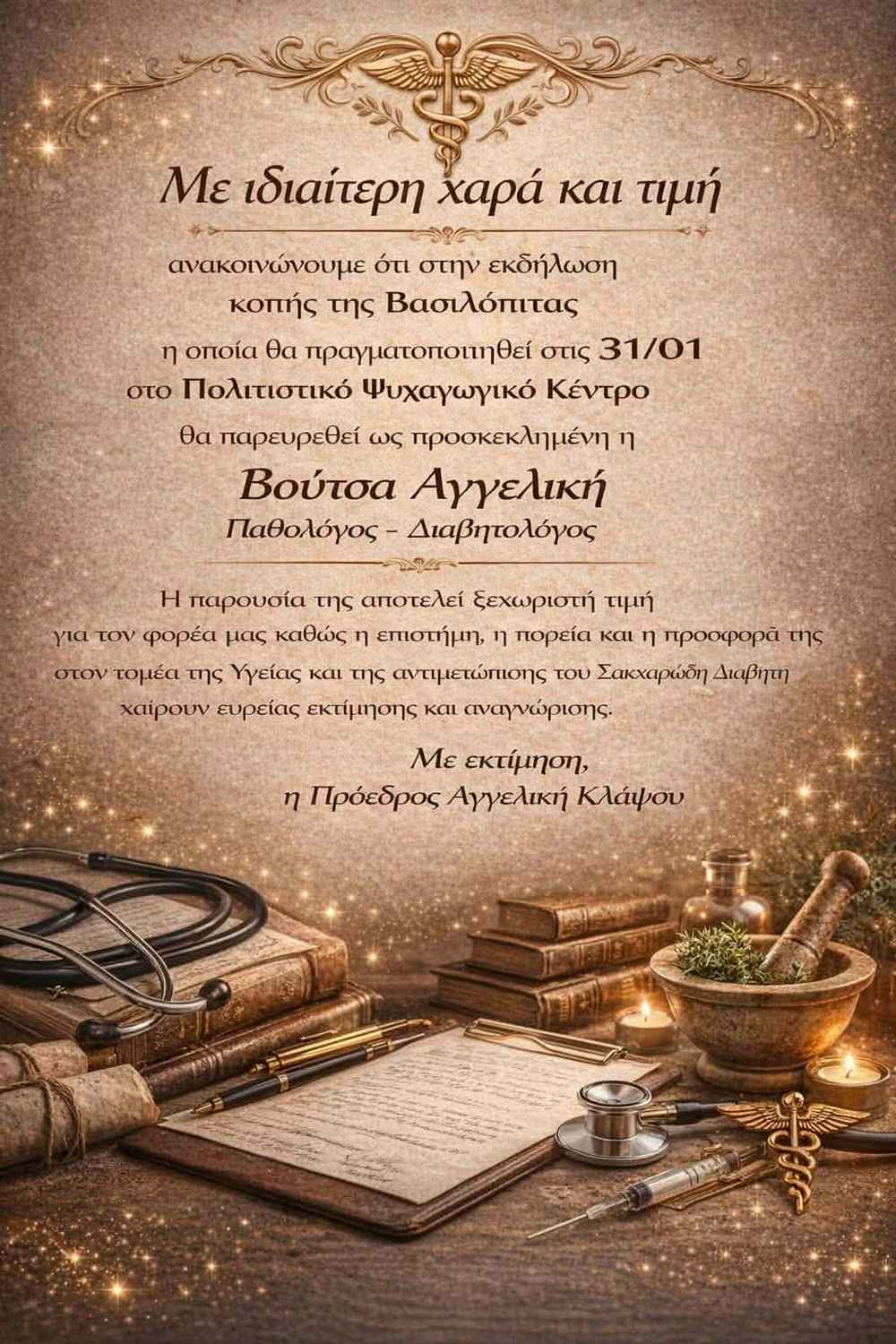 Το ενδιαφέρον όμως ανεβαίνει ακόμη περισσότερο με την παρουσία της προσκεκλημένης της βραδιάς, της παθολόγου και διαβητολόγου Βούτσα Αγγελικής, η οποία δεν θα περιοριστεί σε μια απλή παρουσία. Σύμφωνα με πληροφορίες, η γιατρός θα απευθύνει σύντομη ομιλία με θέμα την υγεία, εστιάζοντας στην πρόληψη και τη σημασία της φροντίδας, ειδικά στη σύγχρονη εποχή που οι ρυθμοί είναι απαιτητικοί.