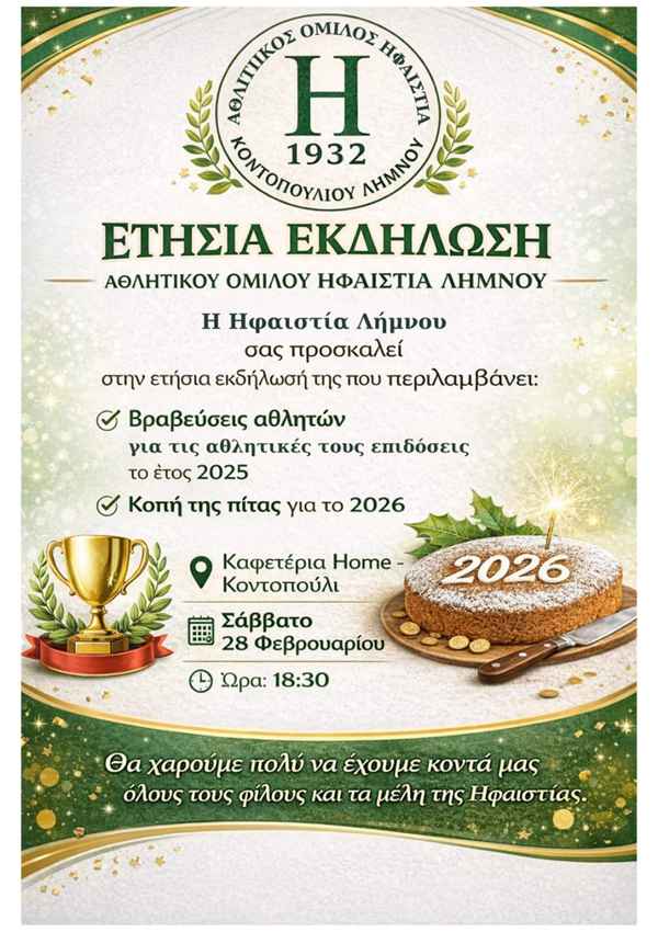 Την ετήσια εκδήλωσή του πραγματοποιεί ο Αθλητικός Όμιλος Ηφαιστία Λήμνου καλώντας φίλους, αθλητές, γονείς και μέλη του συλλόγου σε μια όμορφη βραδιά αφιερωμένη στον αθλητισμό, την προσπάθεια και τη συλλογικότητα!