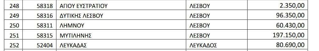 Στο πλαίσιο αυτό, για τον Δήμος Αγίου Ευστρατίου το ποσό που κατανέμεται ανέρχεται σε 2.350 ευρώ, ενώ για τον Δήμος Λήμνου το αντίστοιχο ποσό ανέρχεται σε 60.430 ευρώ.