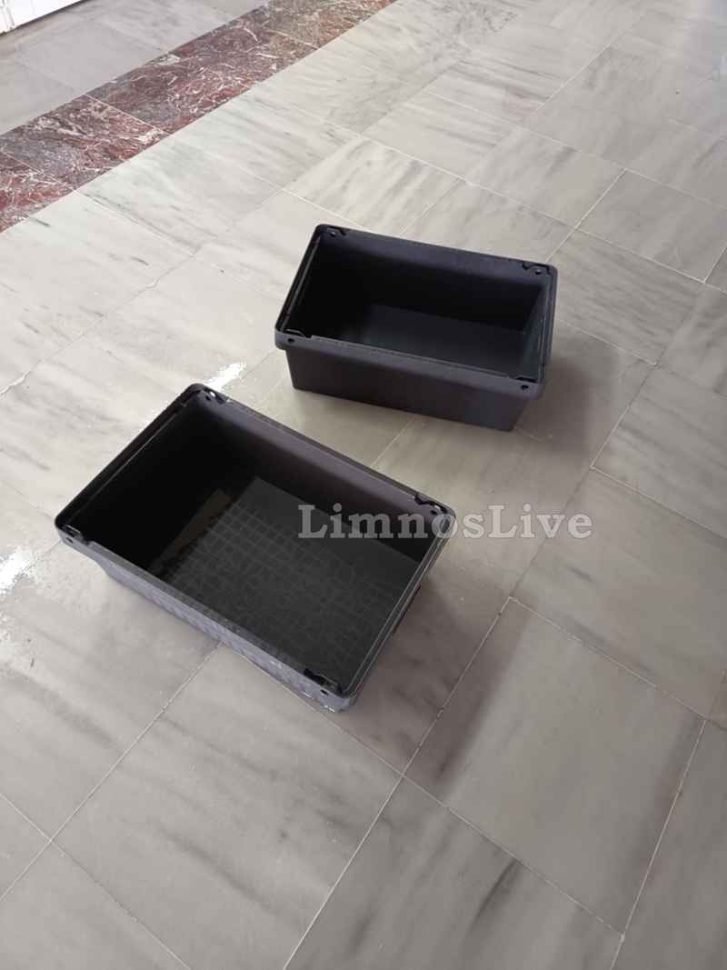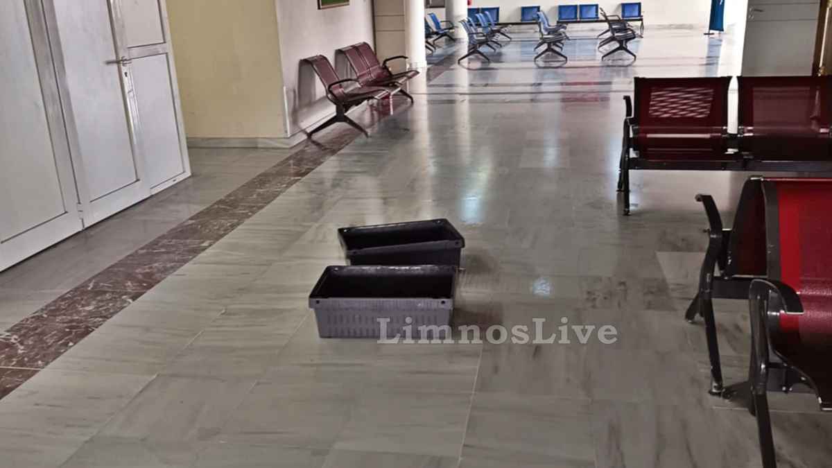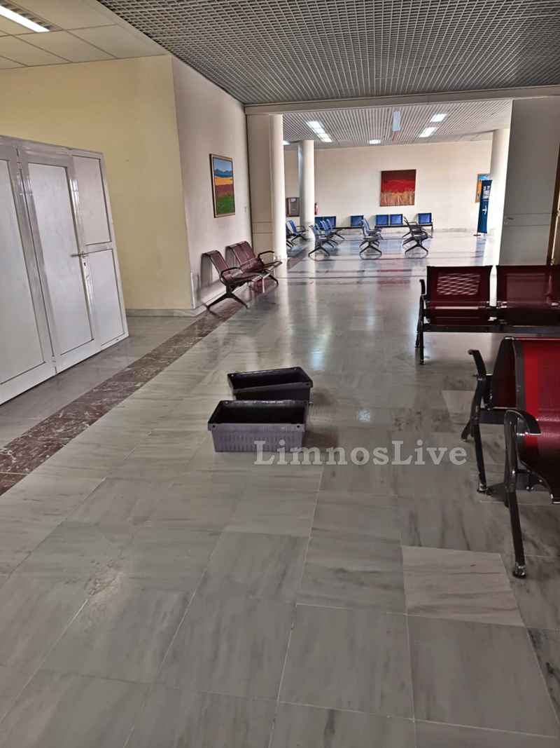 Όπως βλέπετε και στις εικόνες, στο αεροδρόμιο φαίνεται να επένδυσαν σε εξοπλισμό υψηλής τεχνολογίας μαύρες πλαστικές λεκάνες στρατηγικά τοποθετημένες στο πάτωμα. Ξεχάστε τις στεγανές οροφές και τη συντήρηση κτιρίων. Αυτά είναι για τους ερασιτέχνες. Στη Λήμνο αν βρέχει έξω, βρέχει και μέσα έτσι, για να μην χάνουμε την επαφή με το περιβάλλον.