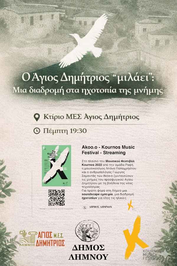 Στο πλαίσιο του Kournos Music Festival, η μουσικολόγος Ντάνα Παπαχρήστου και ο ανθρωπολόγος Γιώργος Σαμαντάς (ομάδα Akoo-o) δημιούργησαν μια μοναδική soundscape εμπειρία. Σκανάροντας με το κινητό σας τα QR codes στις πινακίδες του χωριού, θα μεταφερθείτε σε μια άλλη εποχή, ακούγοντας τραγούδια, μνήμες και ήχους που καθόρισαν την ταυτότητά μας.