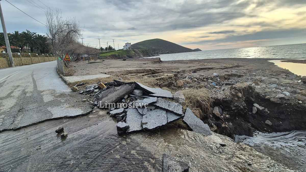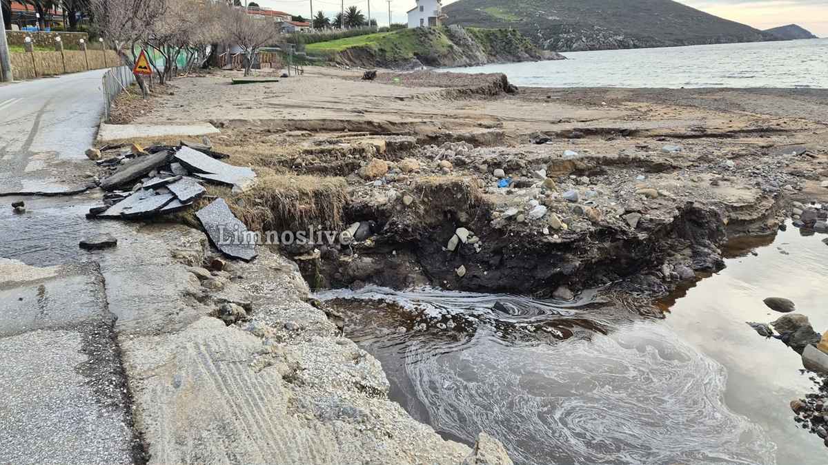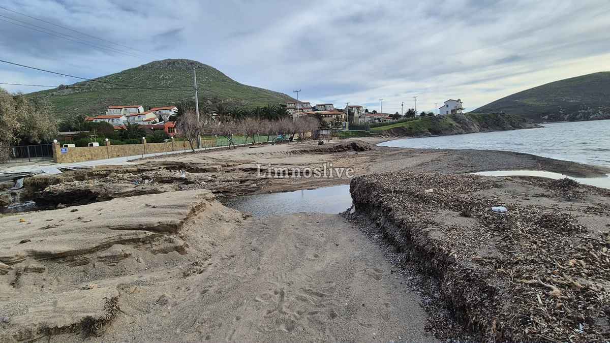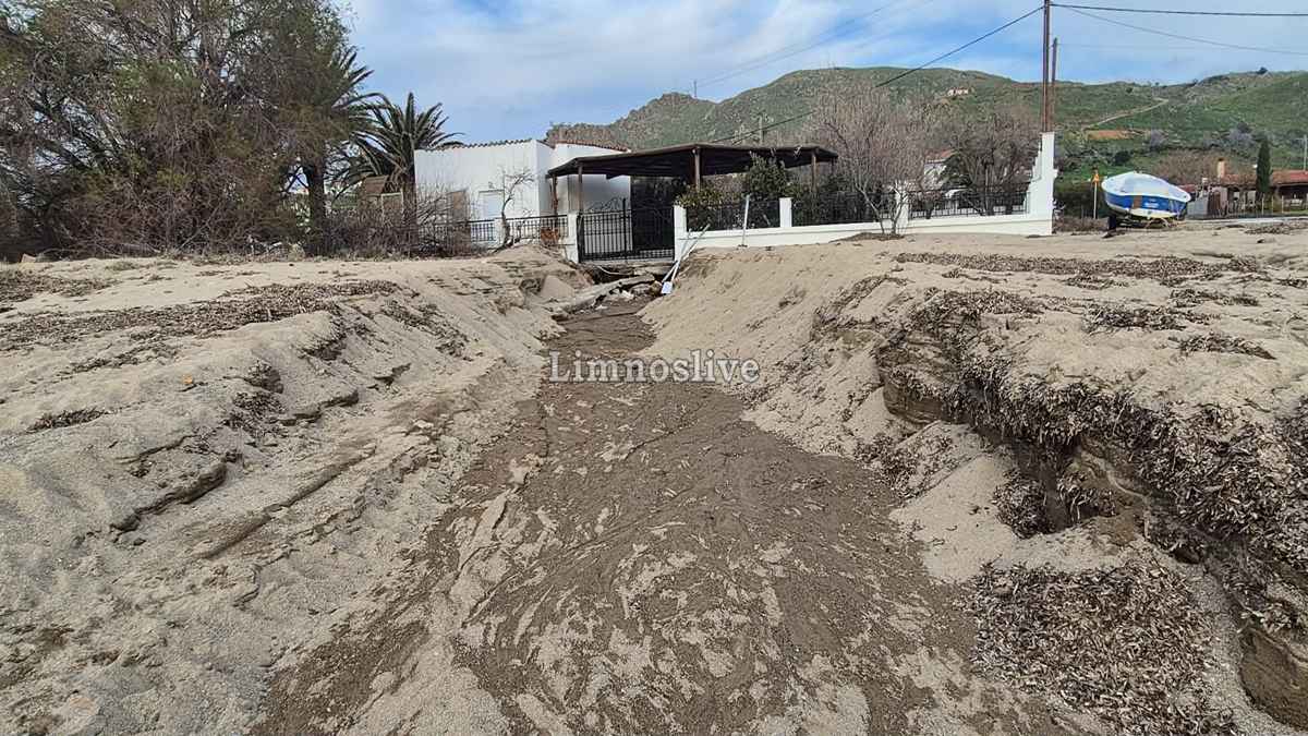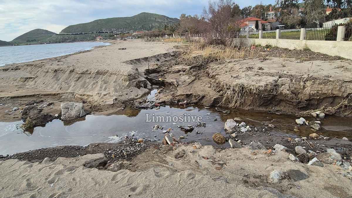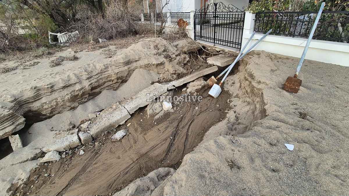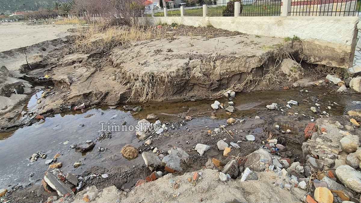 Ο κεντρικός παραλιακός δρόμος σε σημείο πριν το μεγαλύτερο ξενοδοχείο της περιοχής έχει κυριολεκτικά ξεκολλήσει από τη θέση του αποκαλύπτοντας το κενό που δημιουργήθηκε κάτω από το οδόστρωμα από την ορμή του νερού. Ακόμα και ενα γραφικό εκκλησάκι (ιδιόκτητο) στέκει πλέον μετέωρο, καθώς το τοιχίο αντιστήριξης και η θεμελίωσή του υποχώρησαν πλήρως. Αυλές σπιτιών έχουν μετατραπεί σε λίμνες, καλλιέργειες έχουν θαφτεί κάτω από τόνους λάσπης και φερτών υλικών, ενώ μάντρες και τοιχία έχουν καταρρεύσει σαν τραπουλόχαρτα, η παραλία έχει κυριολεκτικά «κοπεί» στα δύο. Η ορμή των νερών που κατέβηκαν ανεξέλεγκτα από το ρέμα χάραξε βαθιά αυλάκια στην άμμο αφήνοντας πίσω του τρύπες και ακανόνιστους όγκους χώματος που μαρτυρούν τη βιαιότητα του φαινομένου.