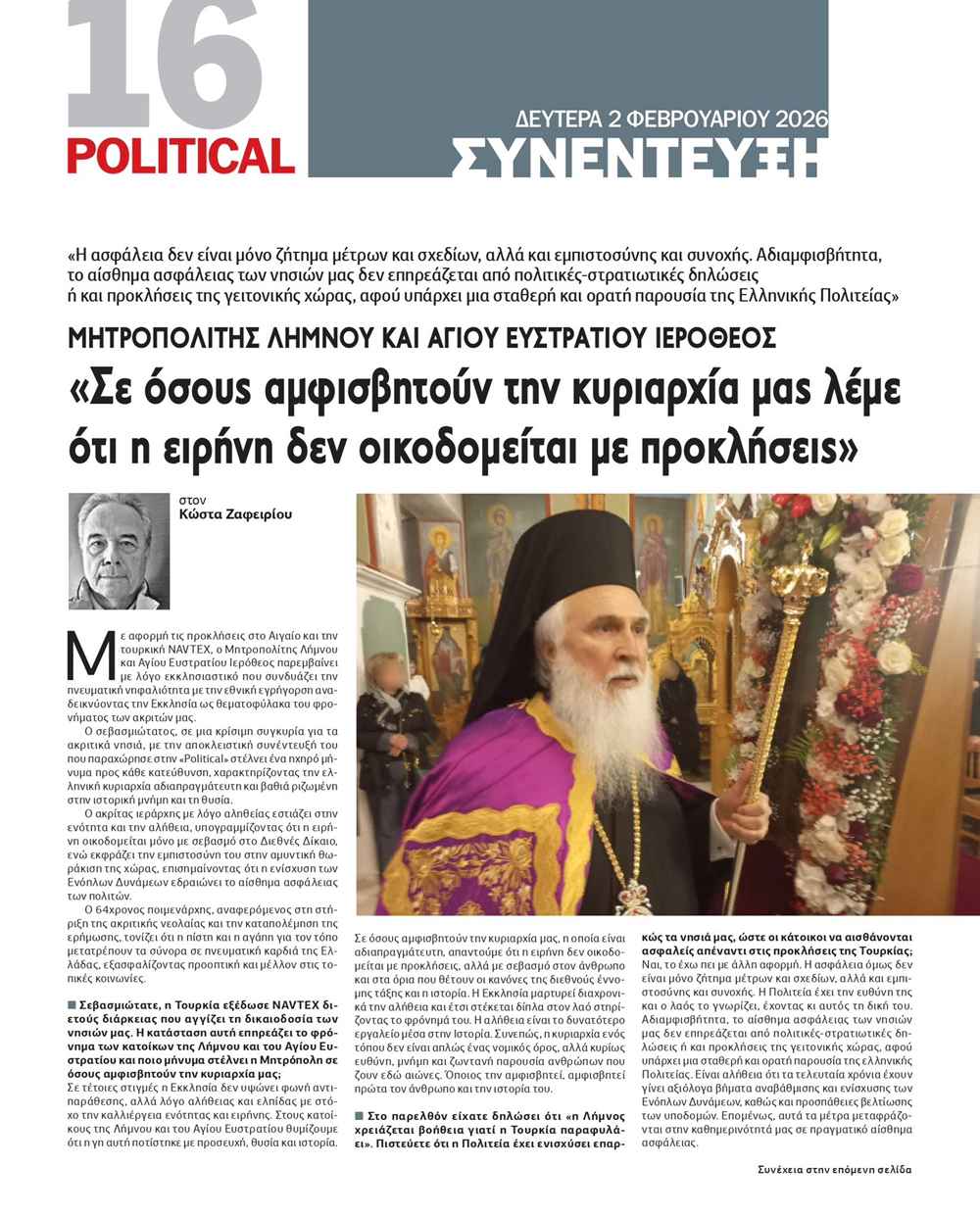 Συνέντευξη παραχώρησε ο Μητροπολίτης Λήμνου και Αγίου Ευστρατίου στην εφημερίδα Political και στον Κώστα Ζαφειρίου, στέλνοντας ένα ξεκάθαρο μήνυμα εθνικής ενότητας και πνευματικής εγρήγορσης. Σε μια κρίσιμη συγκυρία, με φόντο τις προκλήσεις στο Αιγαίο, ο Σεβασμιώτατος κ. Ιερόθεος μιλά με λόγο αληθείας για την αδιαπραγμάτευτη ελληνική κυριαρχία, τονίζοντας ότι η ειρήνη δεν οικοδομείται με προκλήσεις αλλά με σεβασμό στο Διεθνές Δίκαιο. Αναφερόμενος στη Λήμνο, υπογραμμίζει την σημασία της νησιωτικής μας κοινότητας.