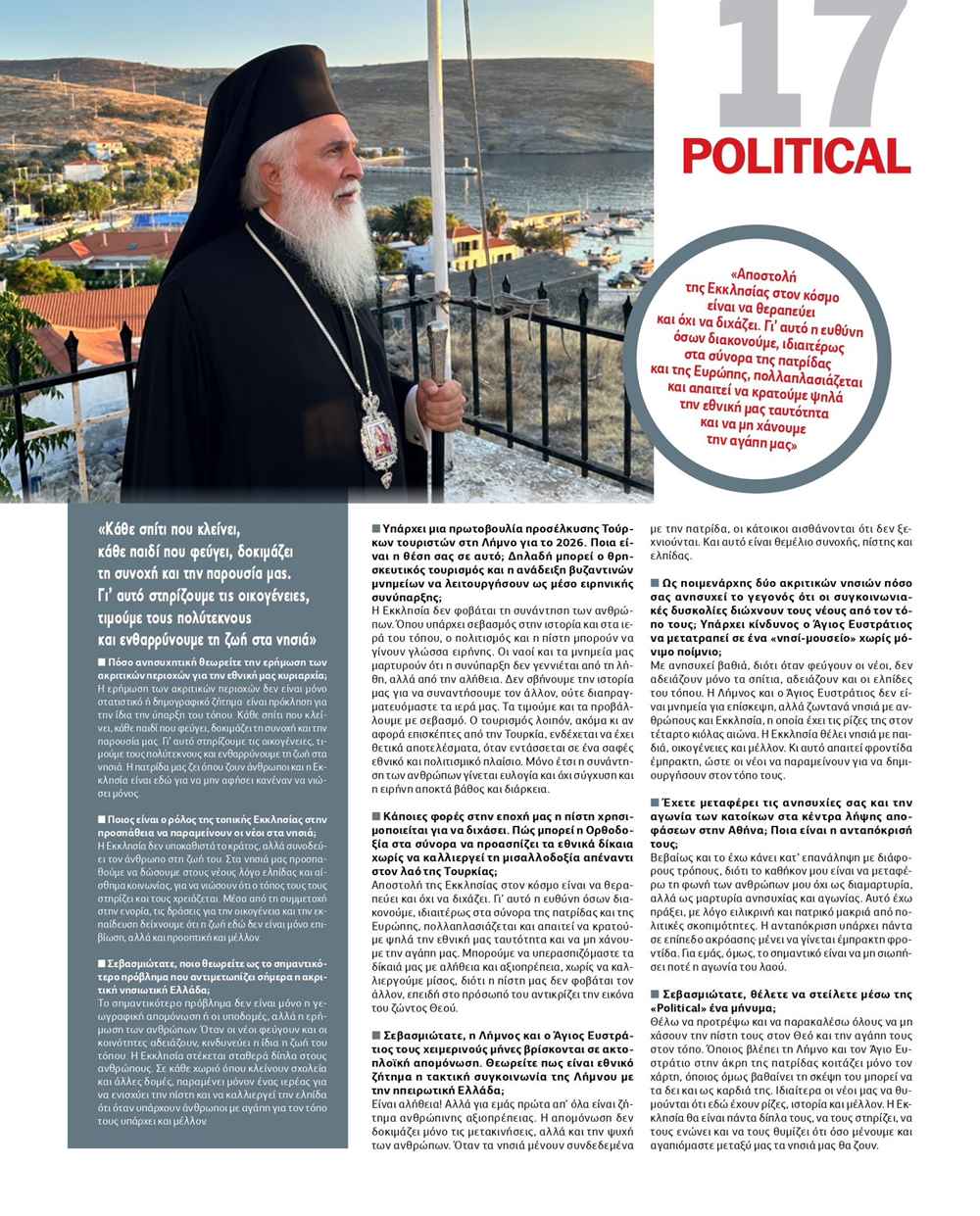 ■ Σεβασμιώτατε, θέλετε να στείλετε μέσω της «Political» ένα μήνυμα; Θέλω να προτρέψω και να παρακαλέσω όλους να μη χάσουν την πίστη τους στον Θεό και την αγάπη τους στον τόπο. Όποιος βλέπει τη Λήμνο και τον Άγιο Ευστράτιο στην άκρη της πατρίδας κοιτάζει μόνο τον χάρτη, όποιος όμως βαθαίνει τη σκέψη του μπορεί να τα δει και ως καρδιά της. Ιδιαίτερα οι νέοι μας να θυμούνται ότι εδώ έχουν ρίζες, ιστορία και μέλλον. Η Εκκλησία θα είναι πάντα δίπλα τους, να τους στηρίζει, να τους ενώνει και να τους θυμίζει ότι όσο μένουμε και αγαπιόμαστε μεταξύ μας τα νησιά μας θα ζουν.