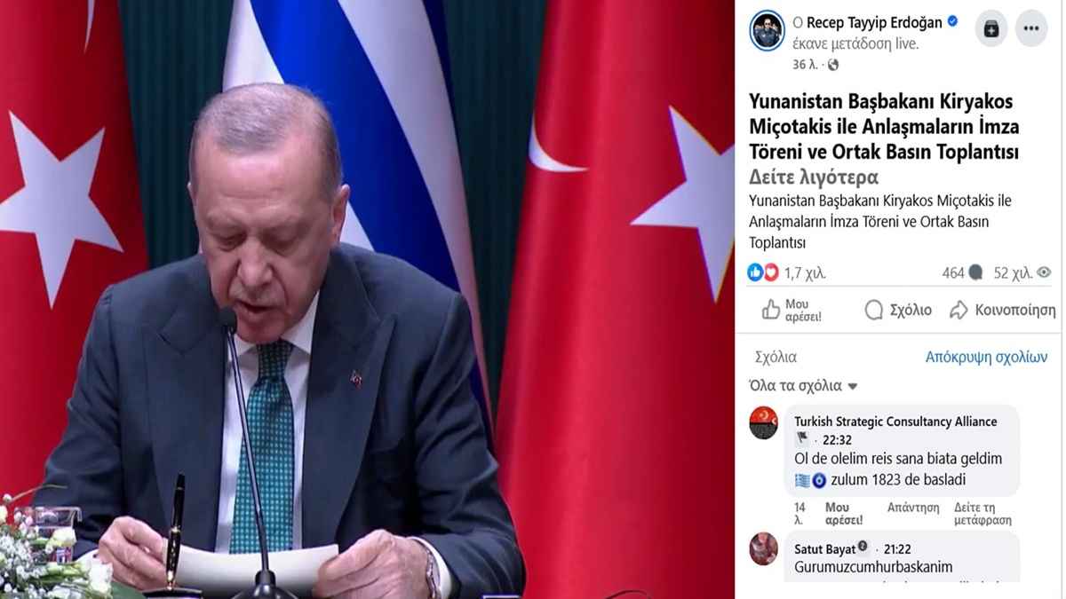 Έντονες αντιδράσεις προκαλεί το βίντεο από την κοινή εμφάνιση του Κυριάκου Μητσοτάκη με τον Ταγίπ Ερντογάν στην Άγκυρα, το οποίο αναρτήθηκε στο επίσημο προφίλ του προέδρου της Τουρκίας στο Facebook με τίτλο: