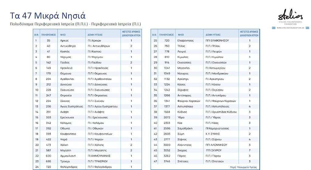 Αθήνα, 5 Μαρτίου 2026. Το Φιλανθρωπικό Ίδρυμα Στέλιος Χατζηιωάννου προχωρά σε μια σημαντική πρωτοβουλία στήριξης της δημόσιας υγείας στα μικρά νησιά της Ελλάδας, διαθέτοντας 10 εκατομμύρια ευρώ σε ορίζοντα επτά ετών για την ενίσχυση της παραμονής 80 ιατρών σε 47 Μικρά Νησιά της χώρας με τις μικρότερες μονάδες πρωτοβάθμιας φροντίδας υγείας. Τα 47 αυτά νησιά εξυπηρετούνται από Περιφερειακά και Πολυδύναμα Περιφερειακά Ιατρεία τις μικρότερες δηλαδή μονάδες υγείας στην Ελλάδα, και δεν αφορά νησιά που έχουν ιατρικά κέντρα ή μεγαλύτερες δομές υγείας.