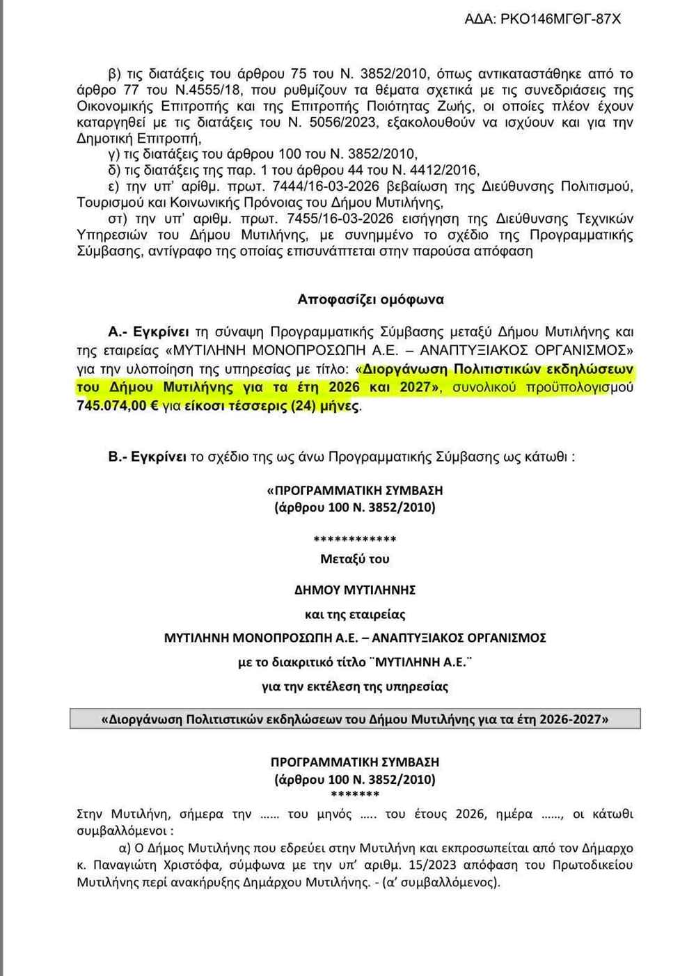 – Η Αναπτυξιακή του Δήμου Μυτιλήνης, που πρόεδρος είναι ο κ.Χριστόφας, υπογράφει προγραμματική σύμβαση ύψους 745.000€ για πολιτιστικές εκδηλώσεις.