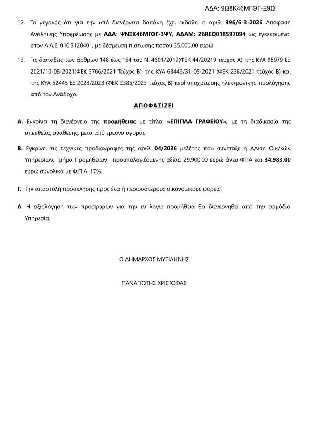 – Ο Δήμαρχος κ.Χριστόφας προχωρά σε απευθείας ανάθεση 35.000€ για έπιπλα γραφείου.