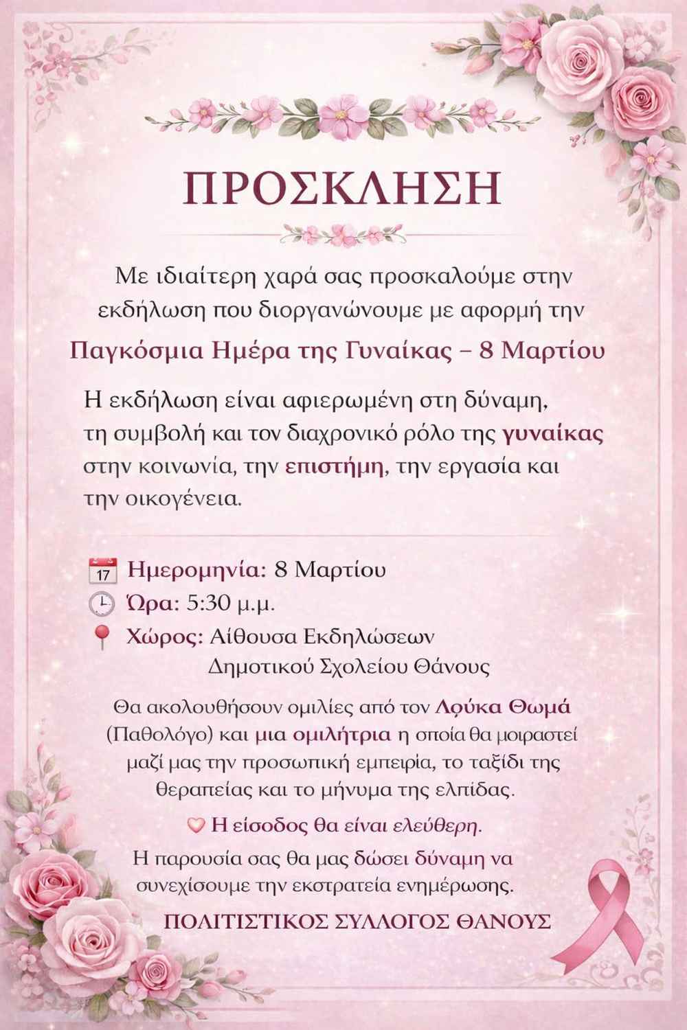 Με αφορμή την Παγκόσμια Ημέρα της Γυναίκας, ο Πολιτιστικός Σύλλογος Θάνους διοργανώνει μια ξεχωριστή εκδήλωση αφιερωμένη στη δύναμη, την προσφορά και τον διαχρονικό ρόλο της γυναίκας στην κοινωνία.