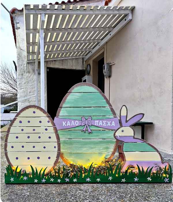 Μικροί και μεγάλοι μπορούν ήδη να απολαύσουν την επίκαιρη εικαστική σύνθεση, που δίνει έναν χαρούμενο τόνο στο χωριό, ενόψει των ημερών του Πάσχα. Τη δημιουργία του έργου επιμελήθηκε ο Έφορος του Συλλόγου, Παντελής Μαλλιωτάκης, με μεράκι και φροντίδα.