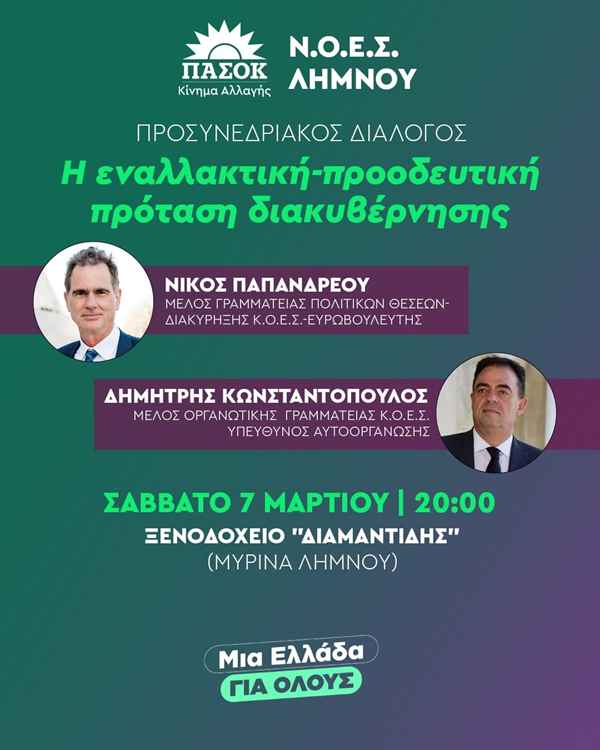 Η Νομαρχιακή Επιτροπή Λήμνου του ΠΑΣΟΚ – Κινήματος Αλλαγής ενημερώνει τα μέλη και τους φίλους του Κινήματος ότι το Σάββατο 07 Μαρτίου και ώρα 20:00, στο Ξενοδοχείο «Διαμαντίδης», θα πραγματοποιηθεί ανοικτή πολιτική εκδήλωση-συζήτηση, στο πλαίσιο του προσυνεδριακού διαλόγου, με κεντρικούς ομιλητές: