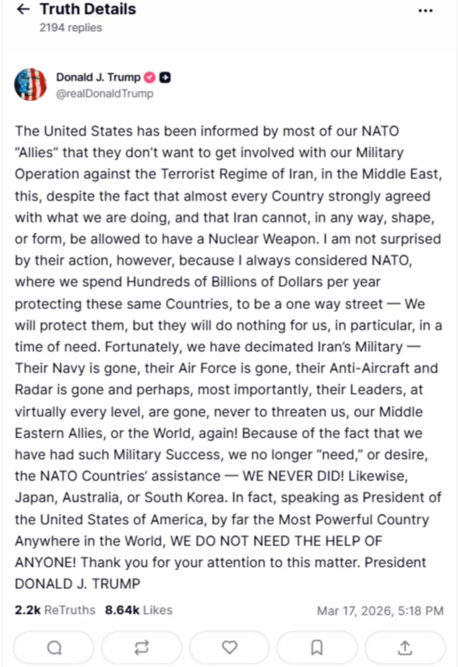 «Οι Ηνωμένες Πολιτείες ενημερώθηκαν από τους περισσότερους από τους “Συμμάχους” του ΝΑΤΟ ότι δεν επιθυμούν να εμπλακούν στην στρατιωτική μας επιχείρηση κατά του τρομοκρατικού καθεστώτος του Ιράν στη Μέση Ανατολή, παρά το γεγονός ότι σχεδόν κάθε χώρα συμφώνησε έντονα με αυτό που κάνουμε και ότι το Ιράν δεν μπορεί, με κανέναν τρόπο, σχήμα ή μορφή, να αποκτήσει πυρηνικά όπλα.» ανέφερε στην ανάρτηση του ο Τραμπ χρησιμοποιώντας το σύνηθες αφήγημα περί «πυρηνικών του Ιράν».