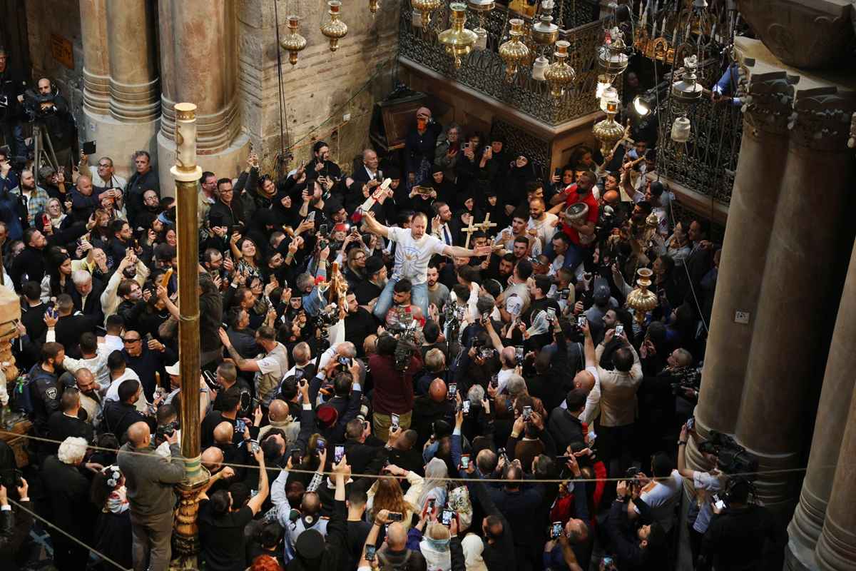Το συγκεντρωμένο πλήθος έσπευσε να λάβει το ανέσπερο φως, με τις καμπάνες να κομίζουν το χαρμόσυνο μήνυμα της Ανάστασης του Κυρίου. Λόγω των αυξημένων μέτρων ασφαλείας που έχει λάβει το Ισραήλ, η είσοδος για φέτος επετράπη μόλις σε 2.750 άτομα, με ειδικό βραχιολάκι.