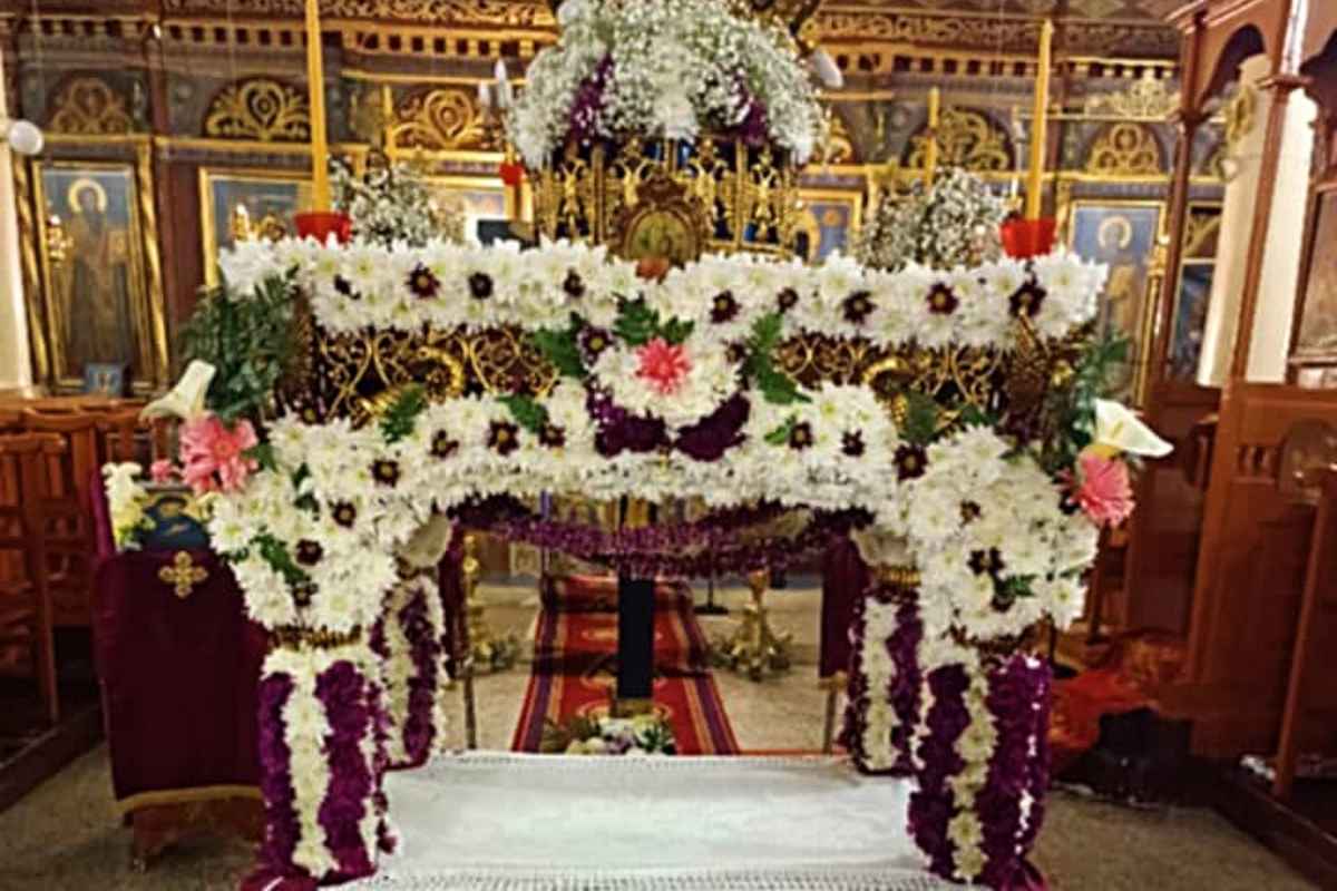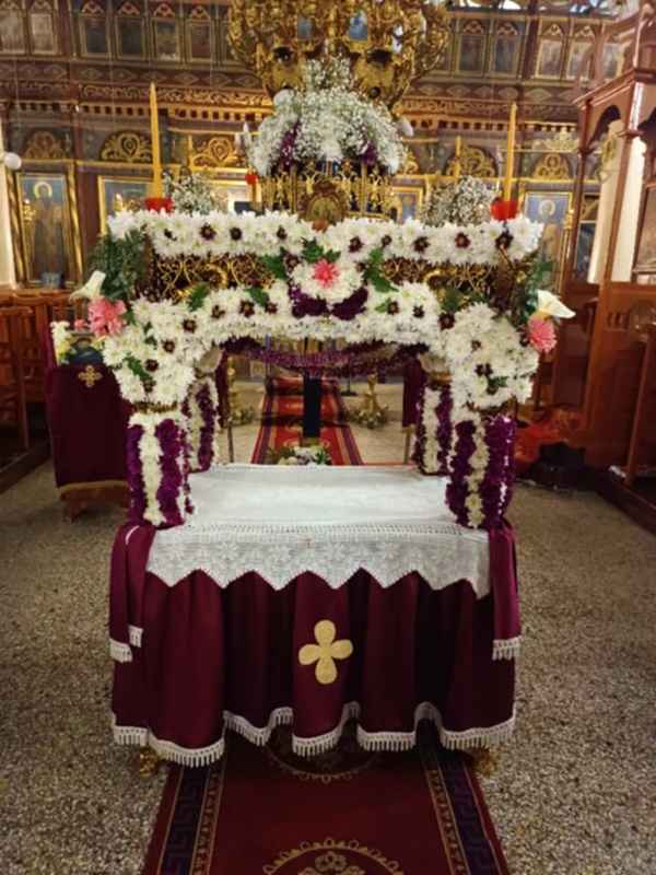 Ο Επιτάφιος του χωριού, στολισμένος με την ακρίβεια και την αγάπη της κοινότητας, στέκεται επιβλητικός στο κέντρο του ναού, περιμένοντας τους πιστούς για τη μεγάλη περιφορά.